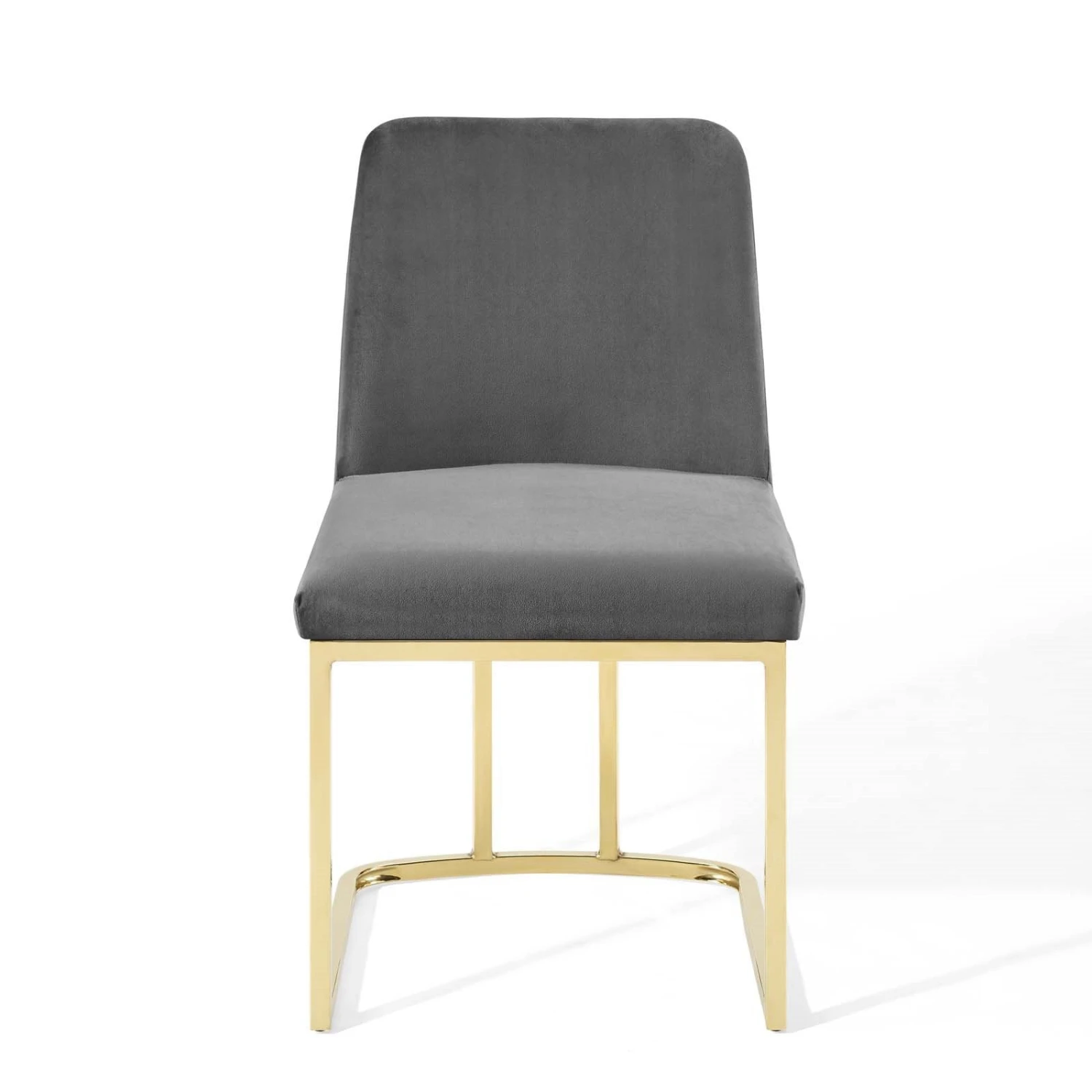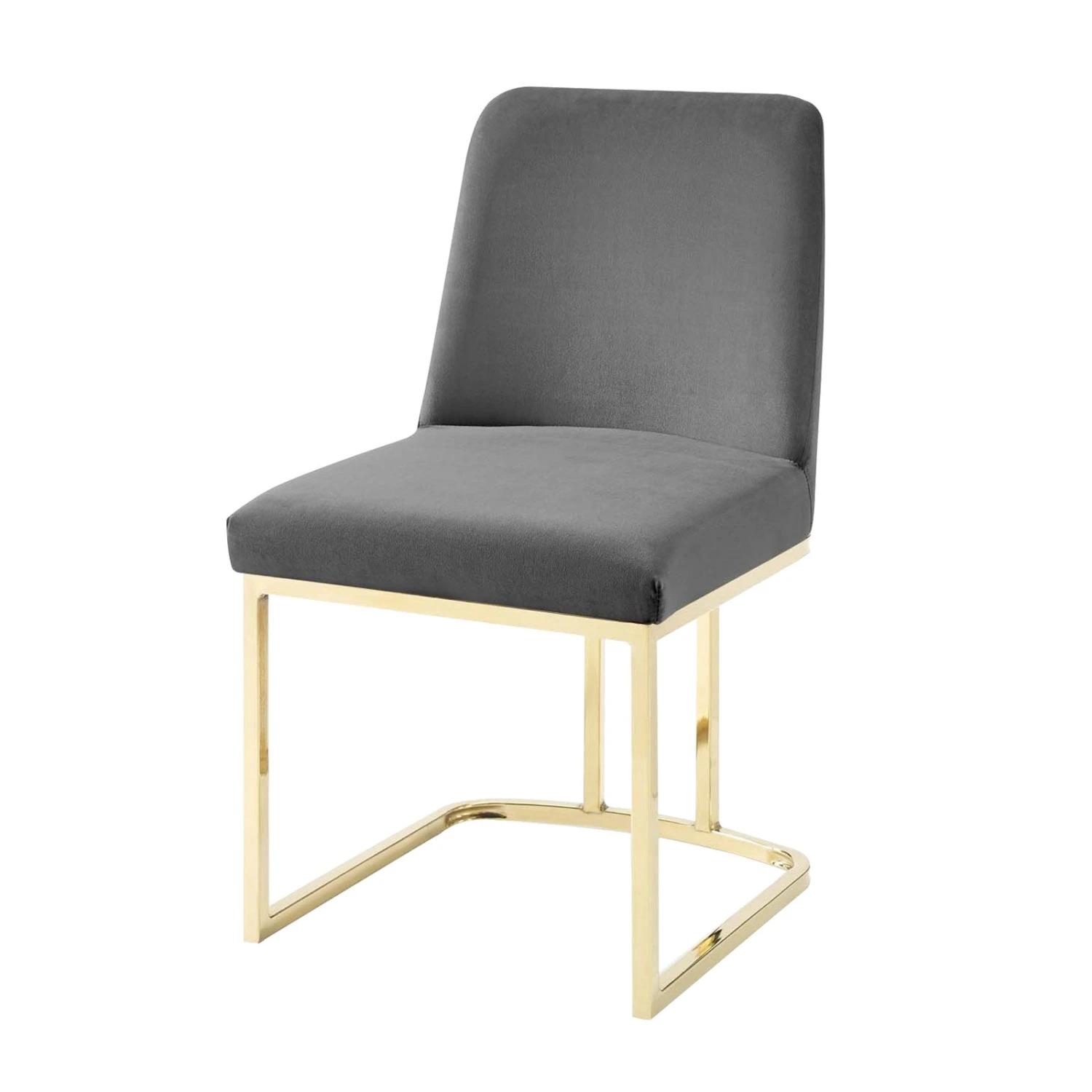 This art deco dining chair is elegant and glamorous with its gold stainless steel tapered legs and grey performance velvet. Great for a dining room or just as classy in the entryway, bedroom or living room.