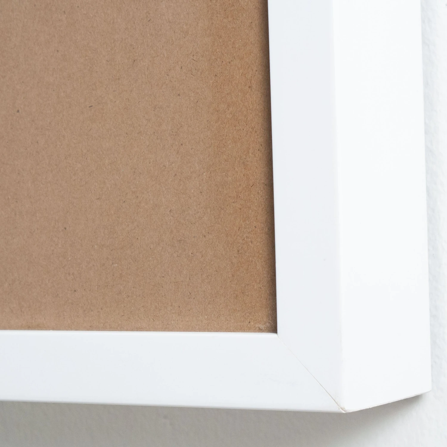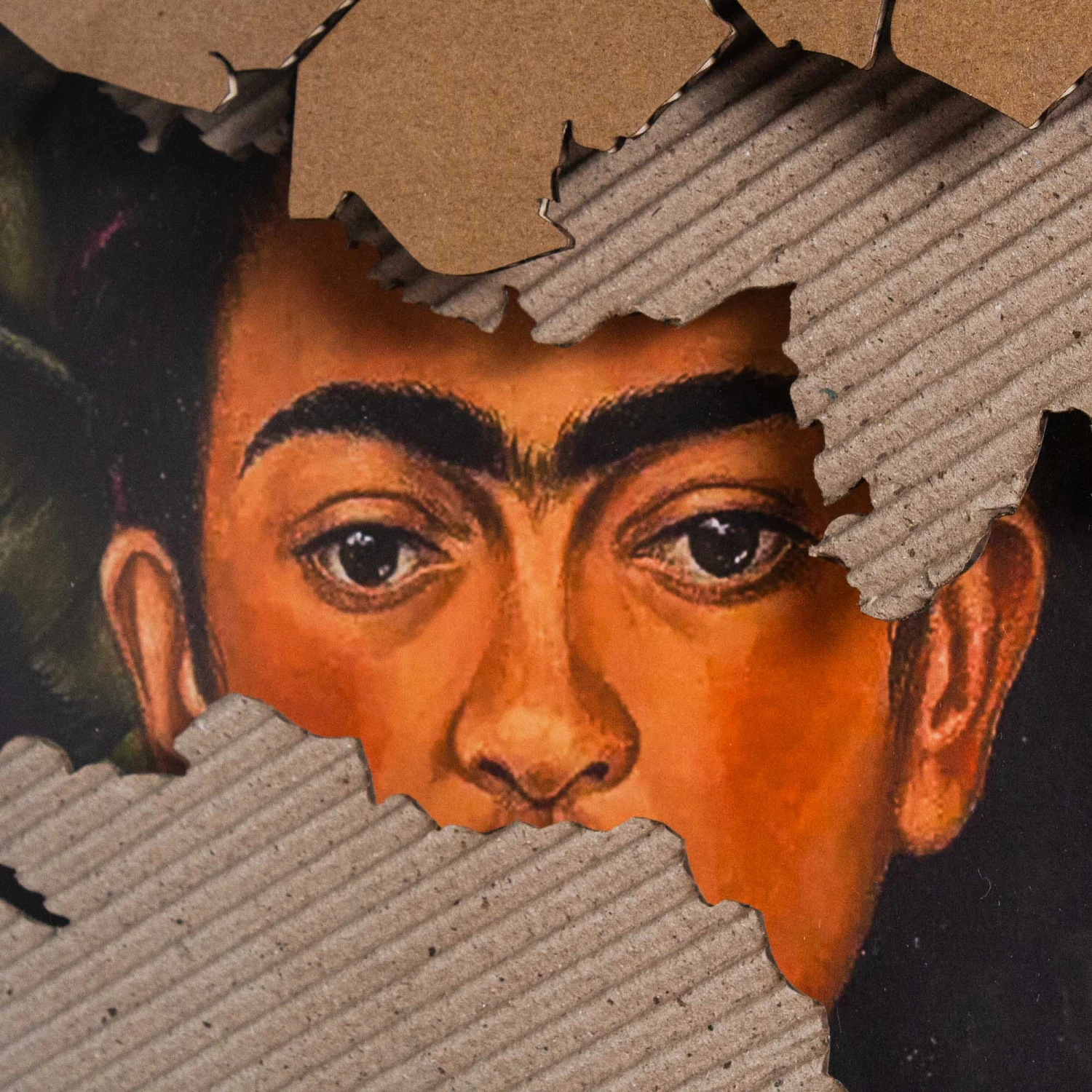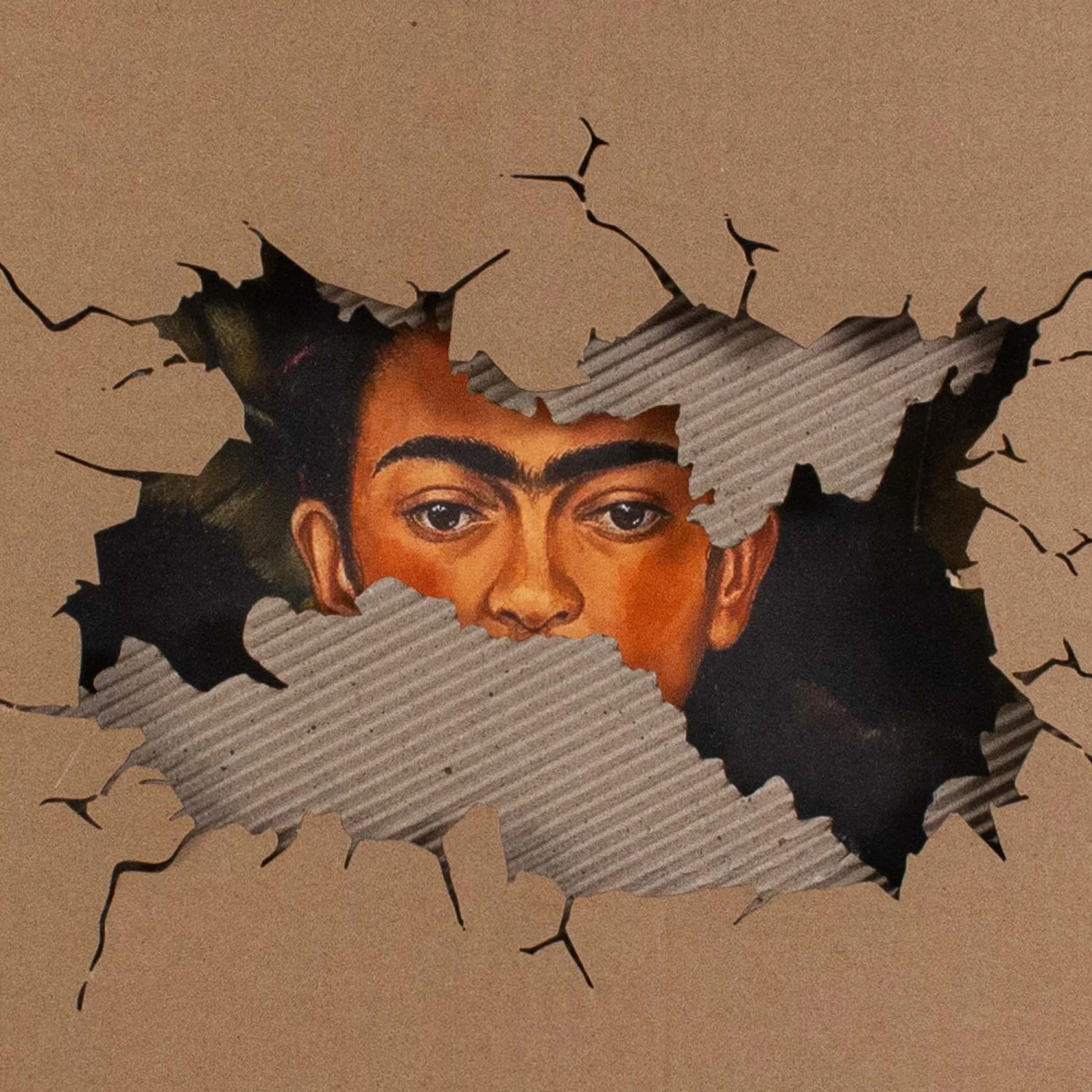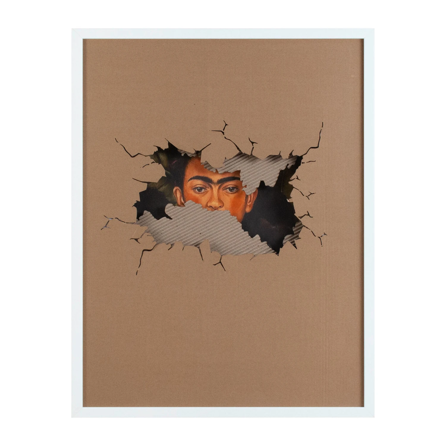A quintessential queen. This Frida painting is hidden behind cardboard for a new spin on a classic. Framed in a white lacquer frame.