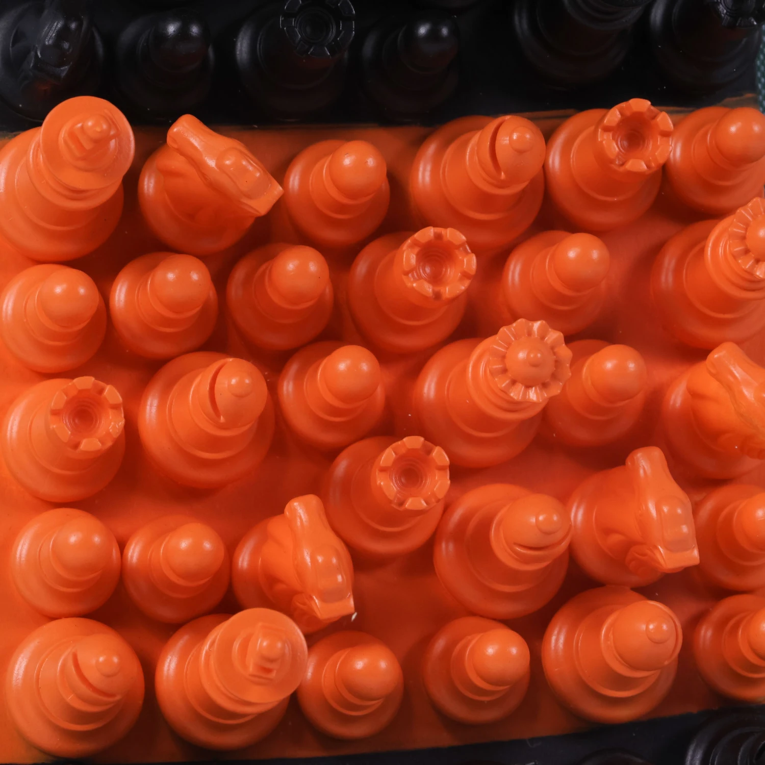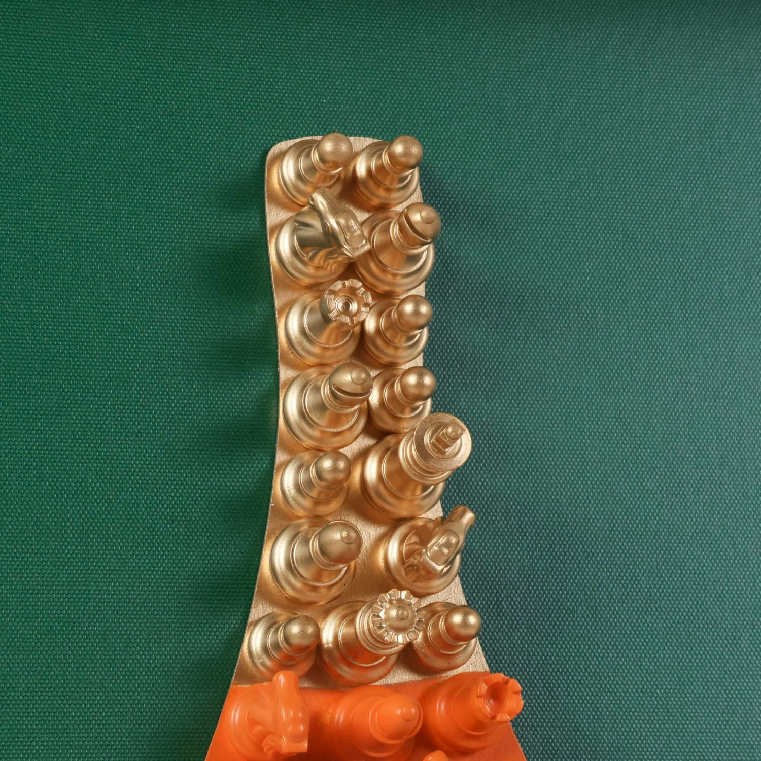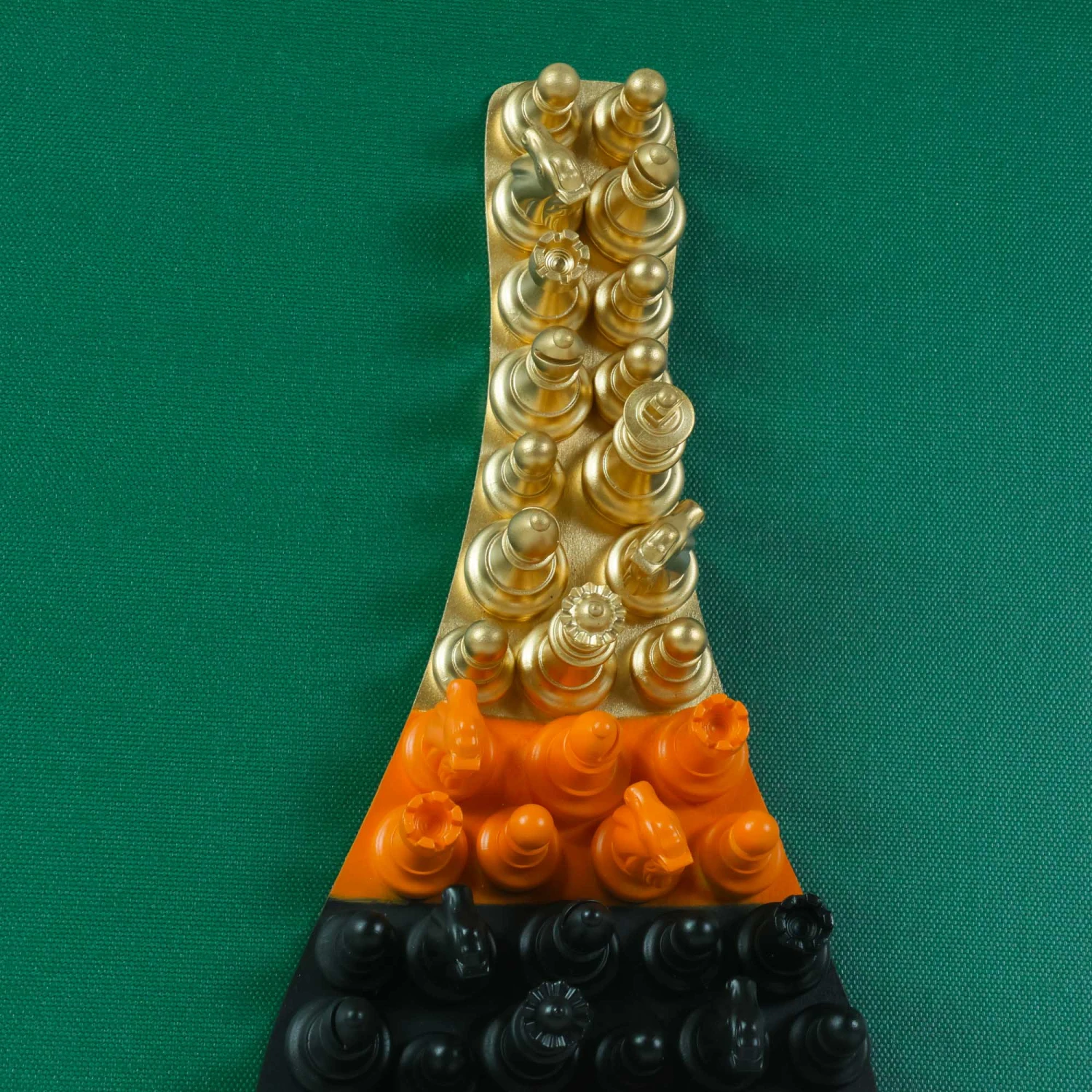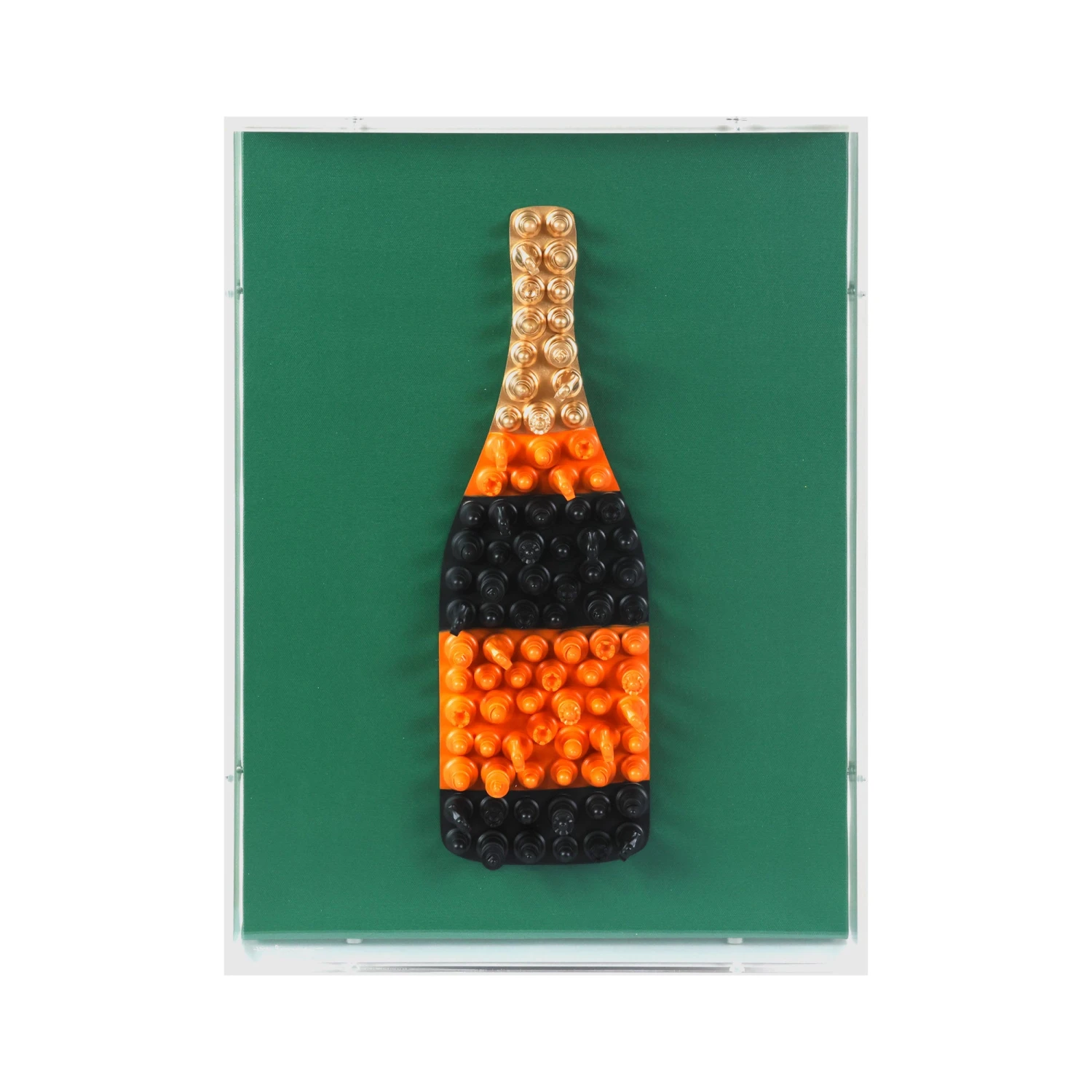 Multicolored chess pieces are individually placed in the shape of a champagne bottle on canvas and framed in an acrylic shadowbox. Each piece is handpainted and slight variations are possible.