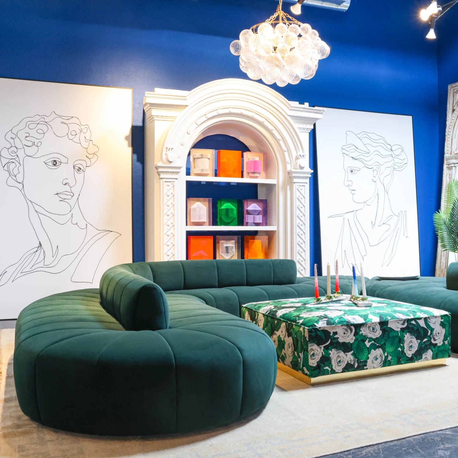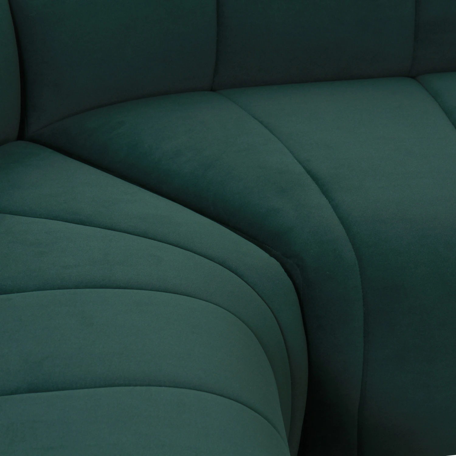 Our Cora Sectional features serpentine curves and all-over channeling. Upholstered in a luxe green velvet, this sectional can be rearranged in multiple ways to best fit your space. Set the contemporary scene with some contemporary curves y’all!