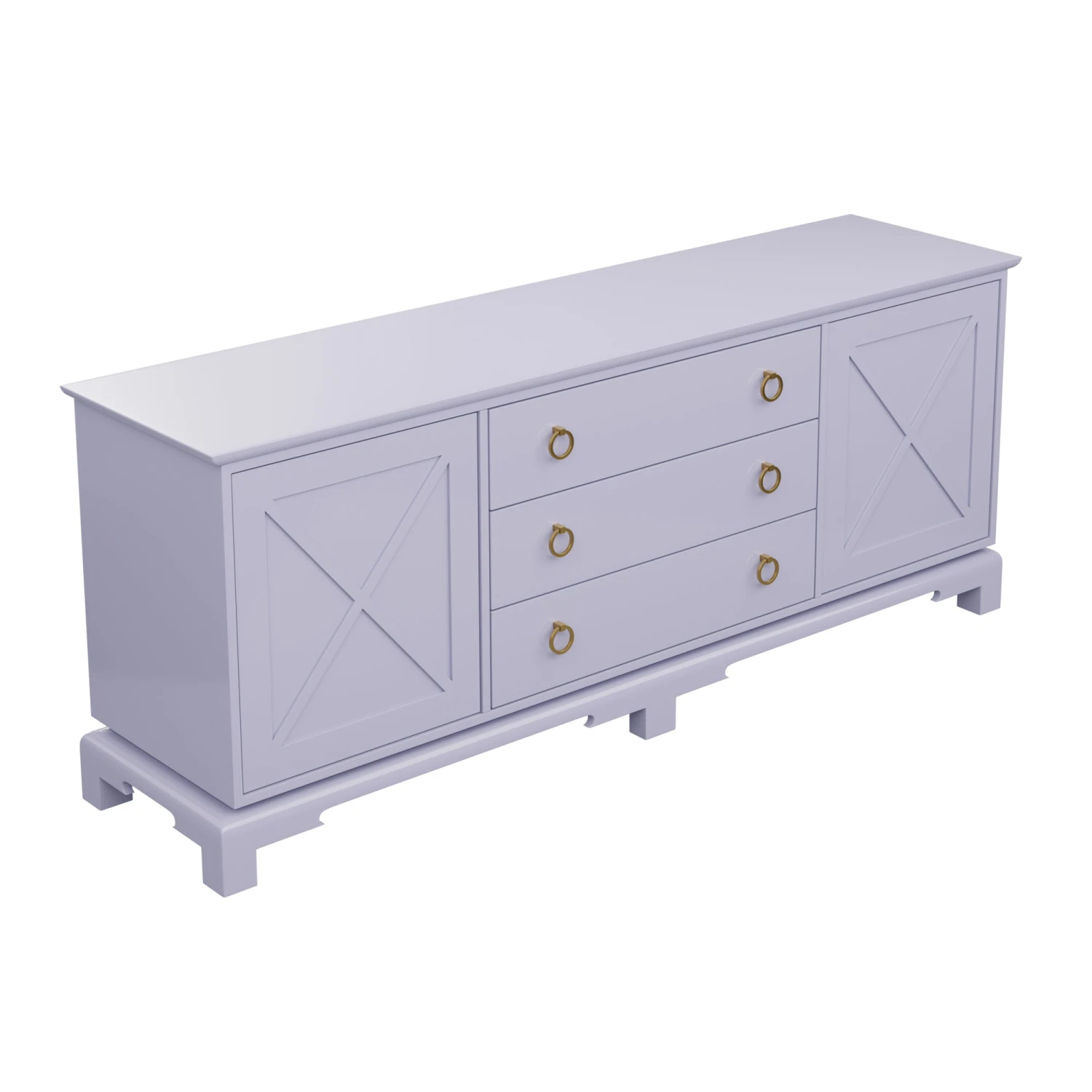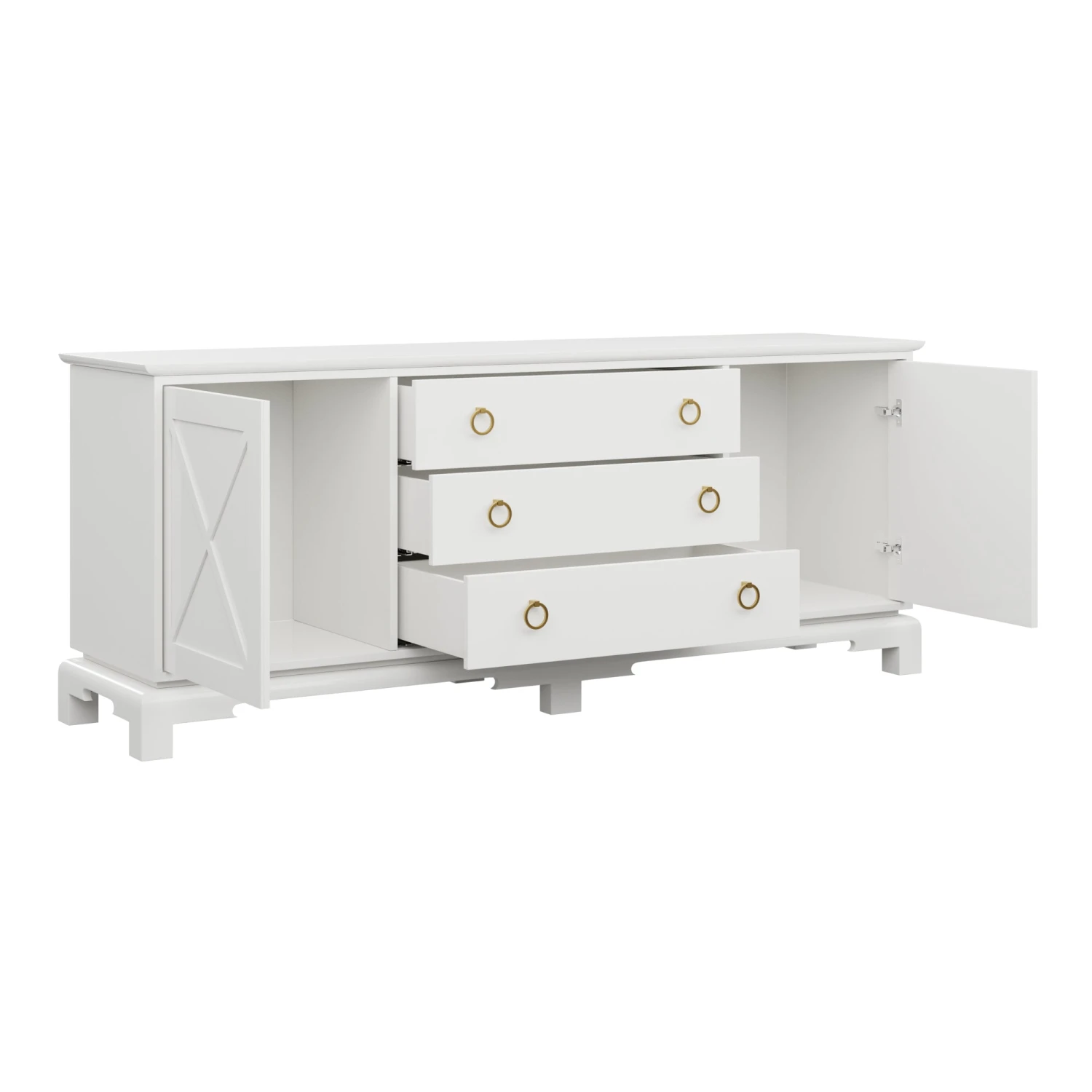 Perfect for a bedroom, living room, or nursery, the Aerin features push-close X doors and 3 center drawers that rest on unique feet.