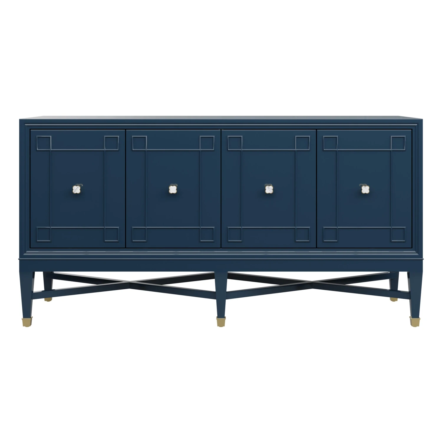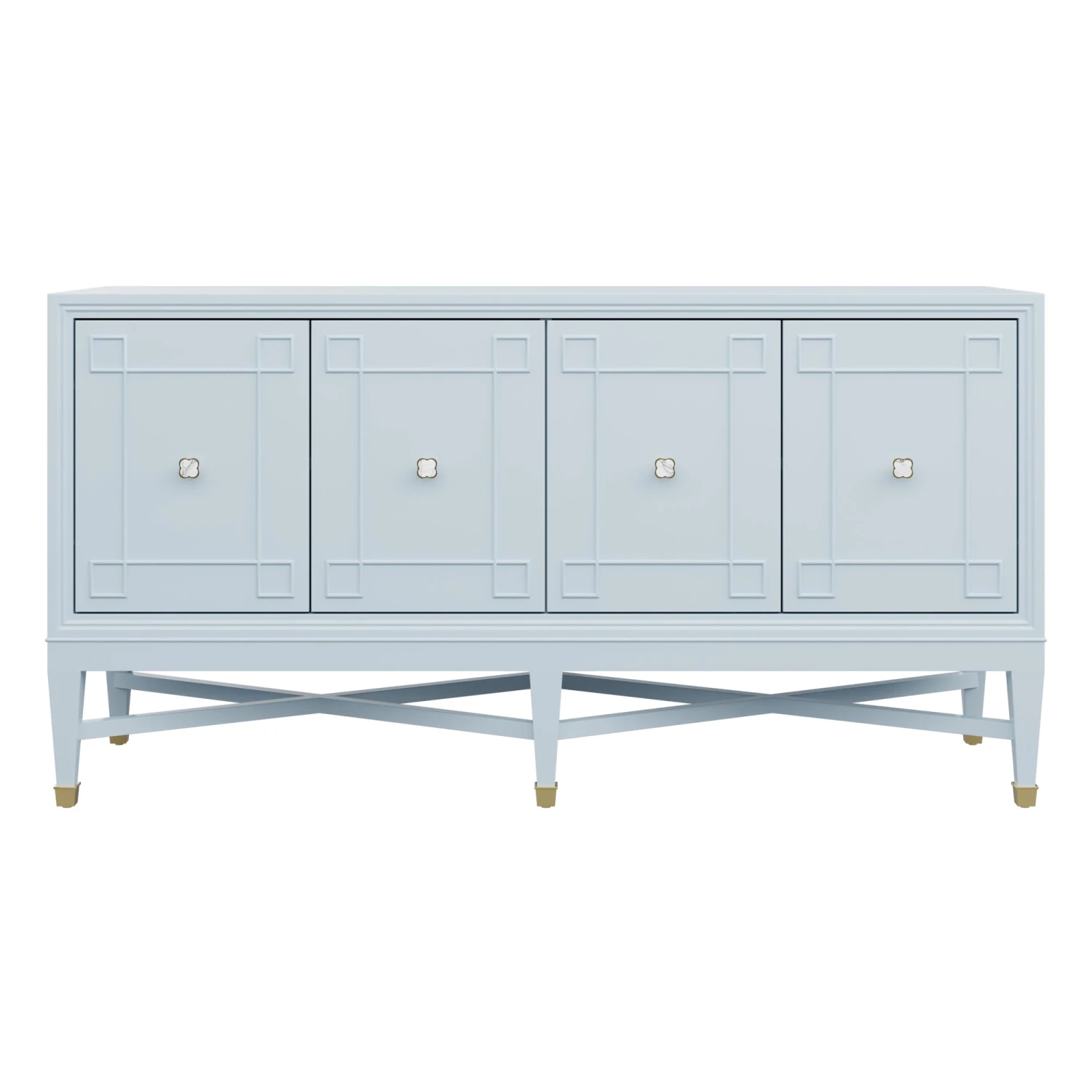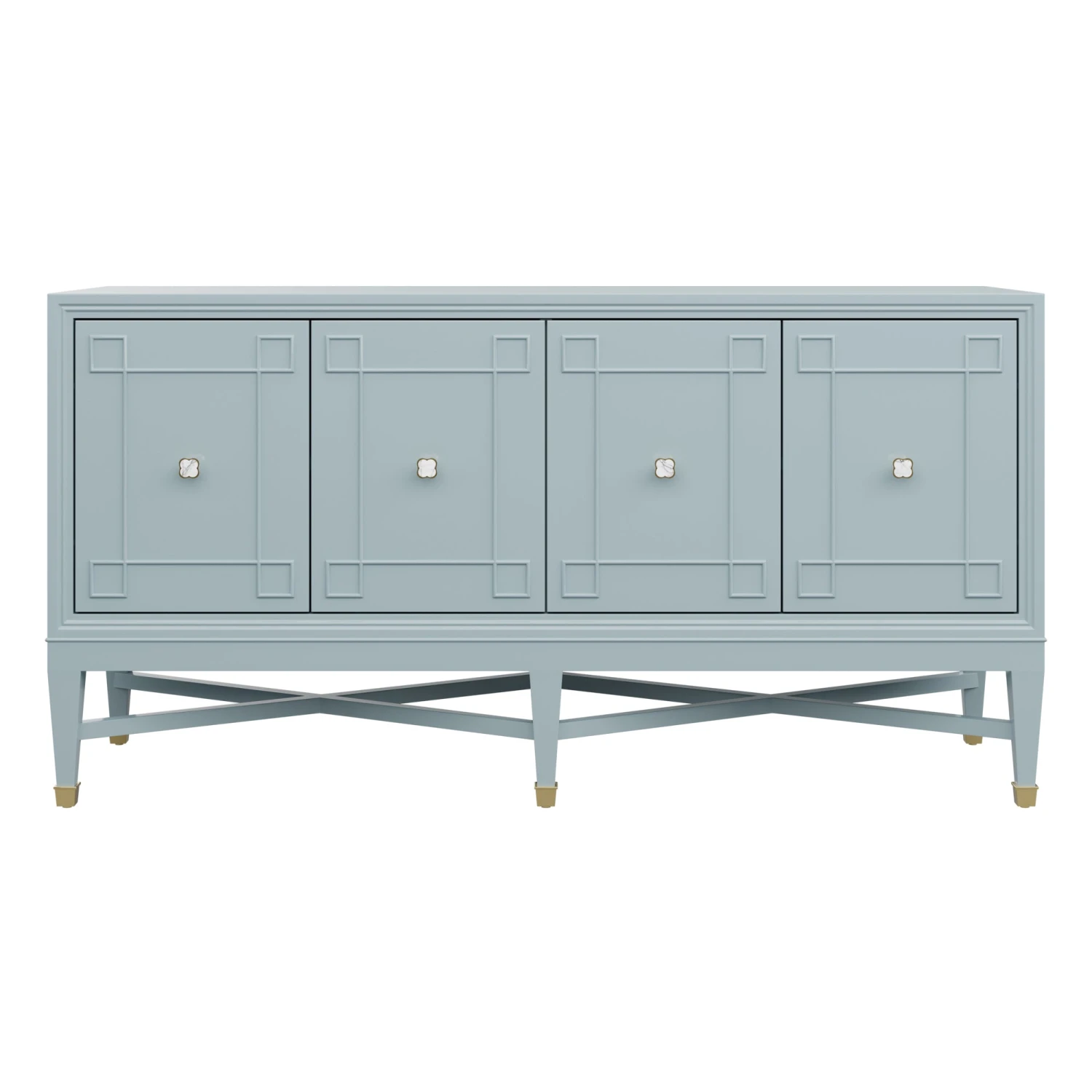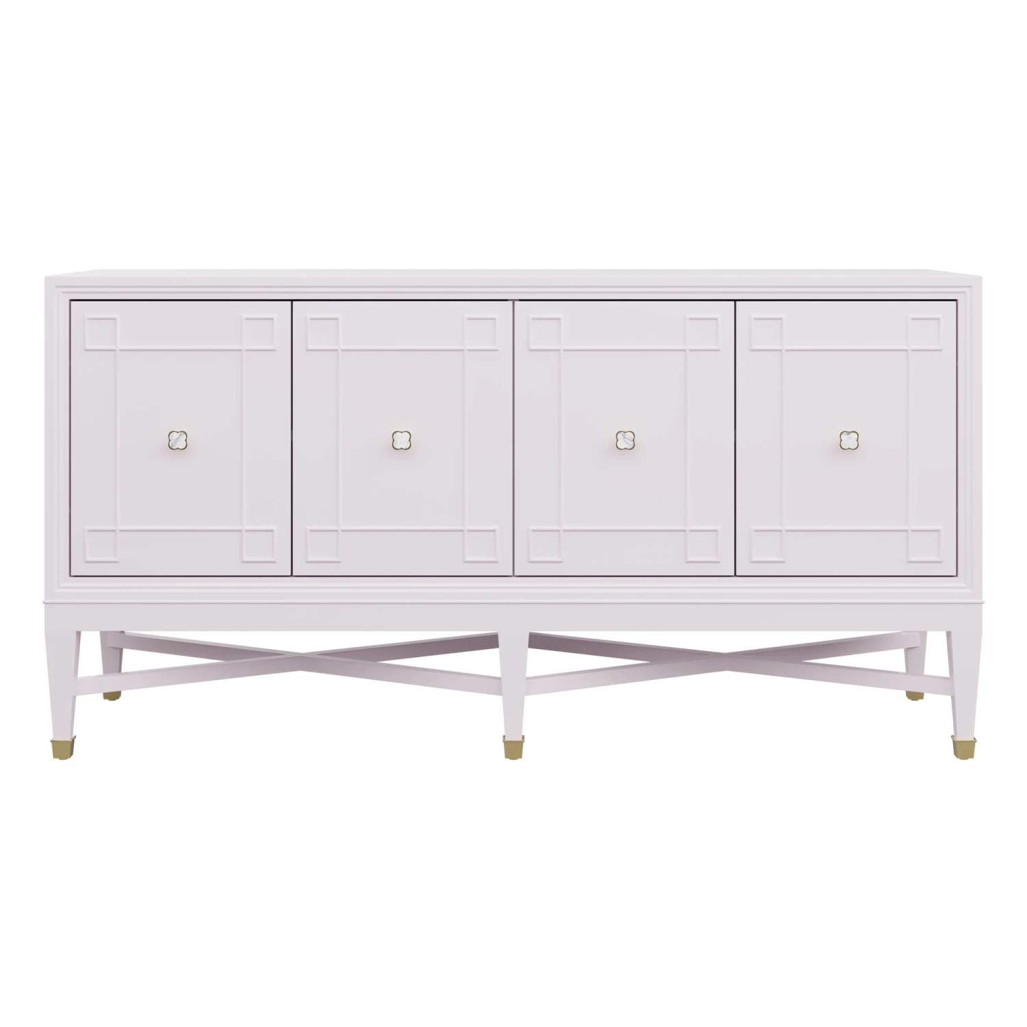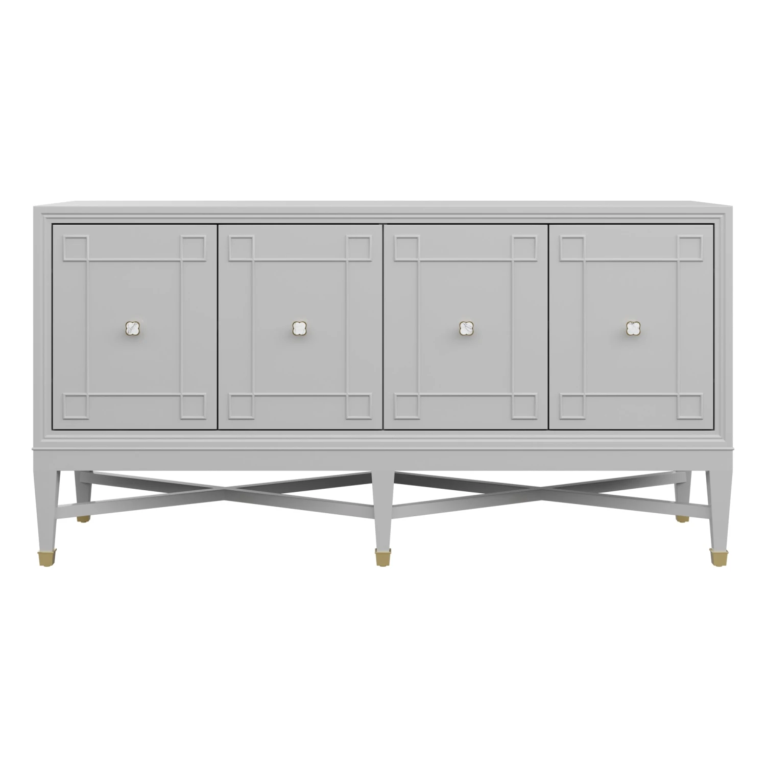 Our bespoke Ariel Credenza features four roomy cabinets with unique carved detailing. Perched atop a double x base and brass sabots, clover hardware adds a lucky touch to this contemporary case good.