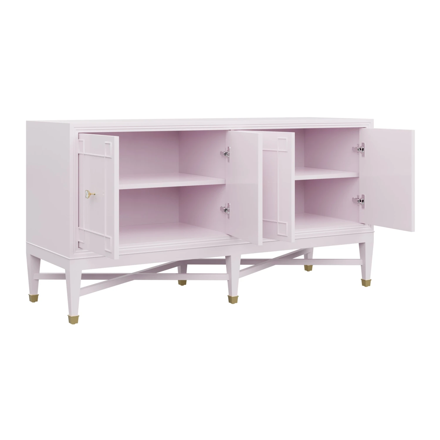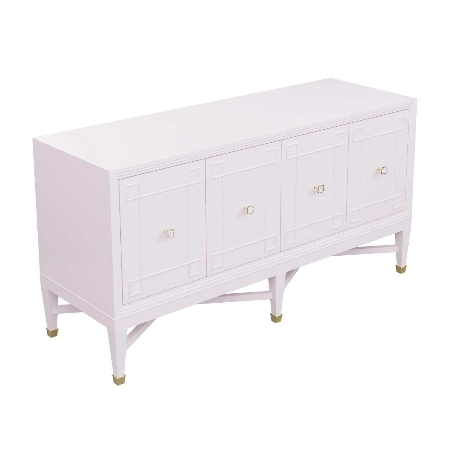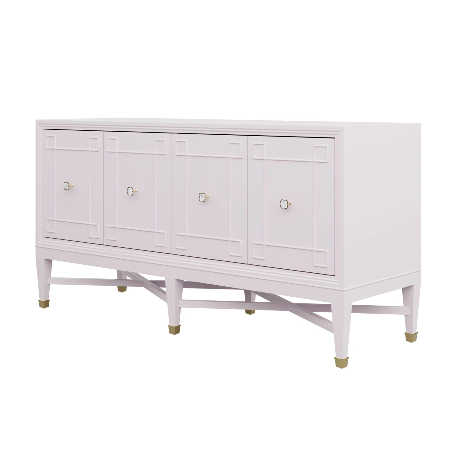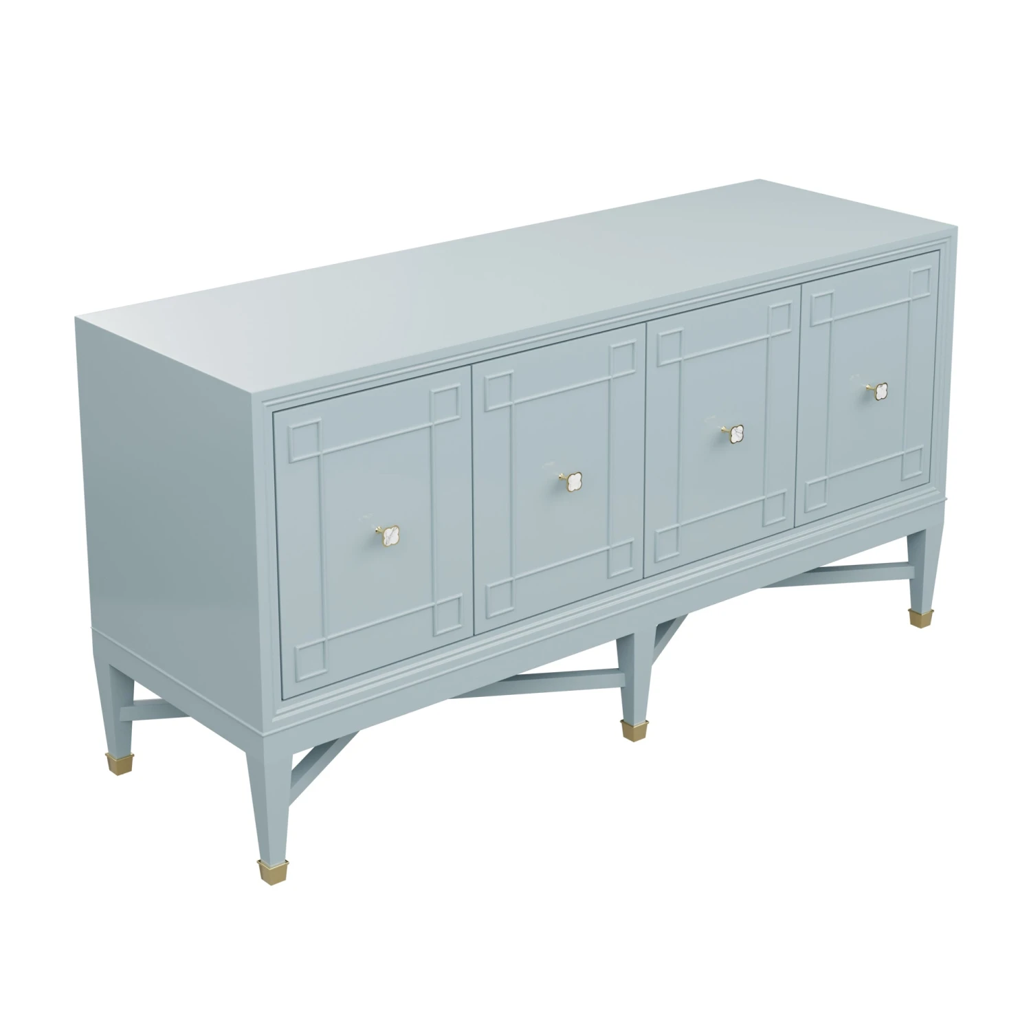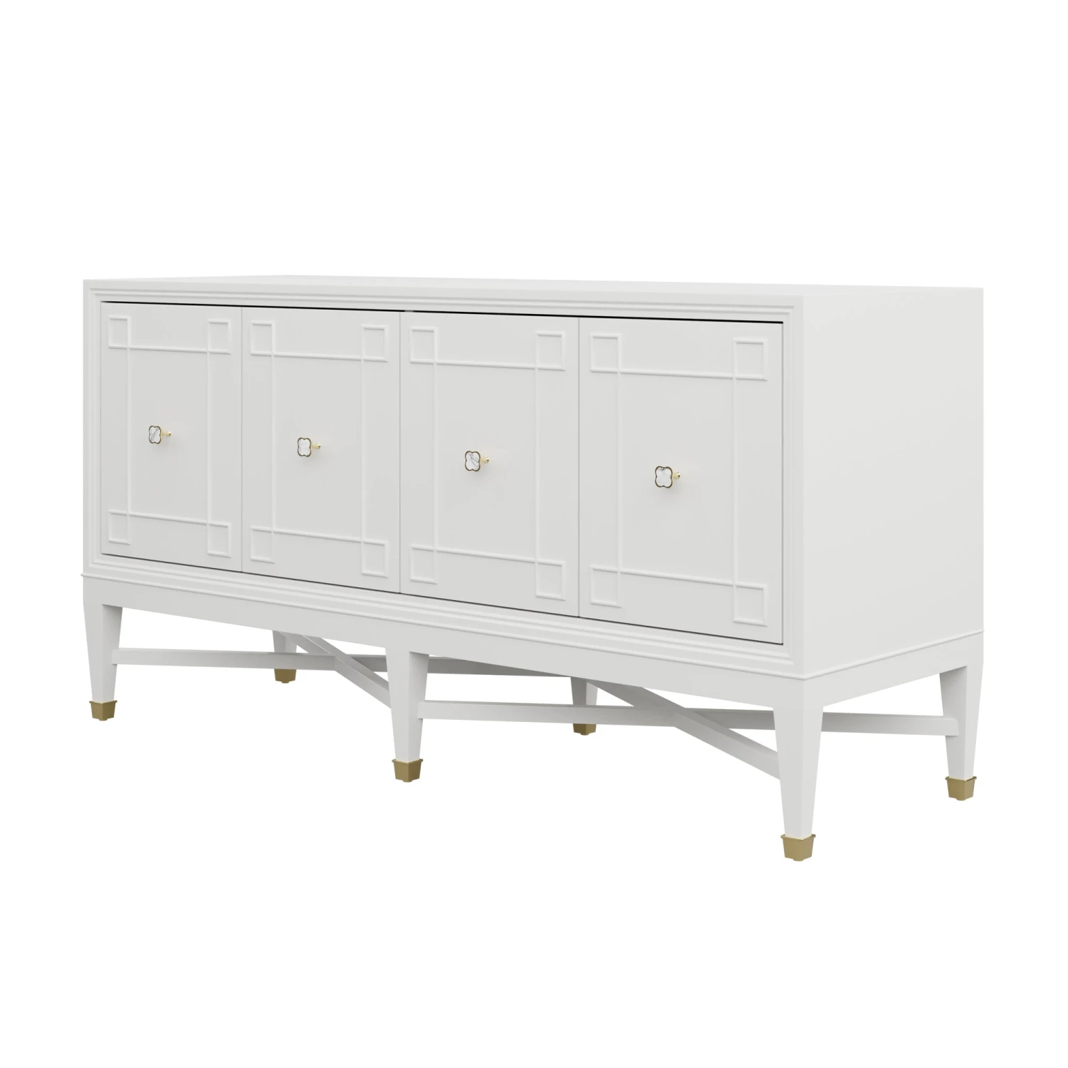 Our bespoke Ariel Credenza features four roomy cabinets with unique carved detailing. Perched atop a double x base and brass sabots, clover hardware adds a lucky touch to this contemporary case good.