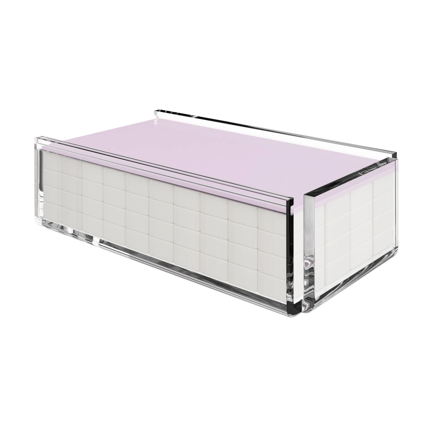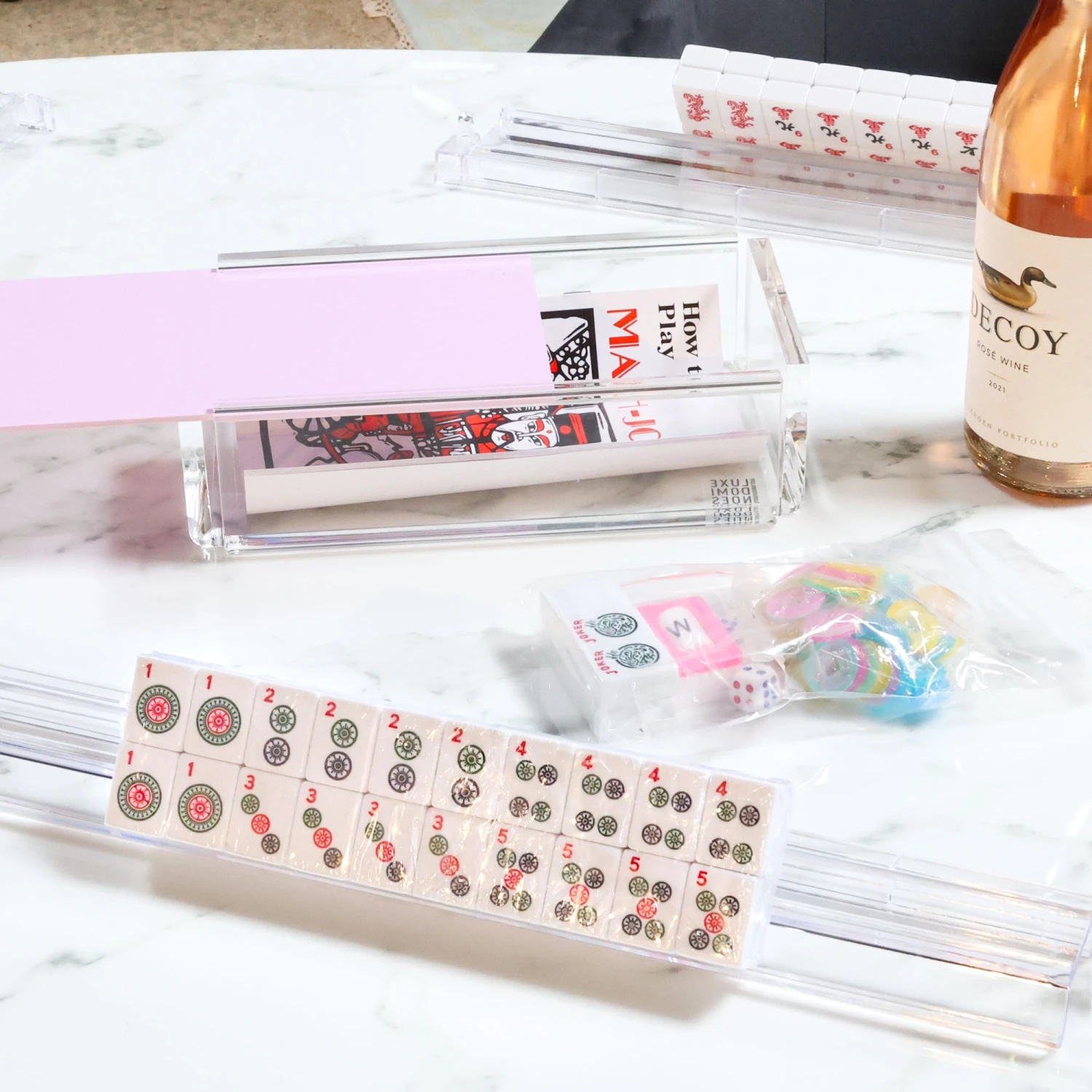 Luxe Dominoes’ Mahjong Set comes with tiles, 4 racks, how to play booklet, 3 extra blank tiles, 2 extra joker tiles and point markers. Each acrylic box is handmade by craftsmen in Miami and features standard all white tiles.Â