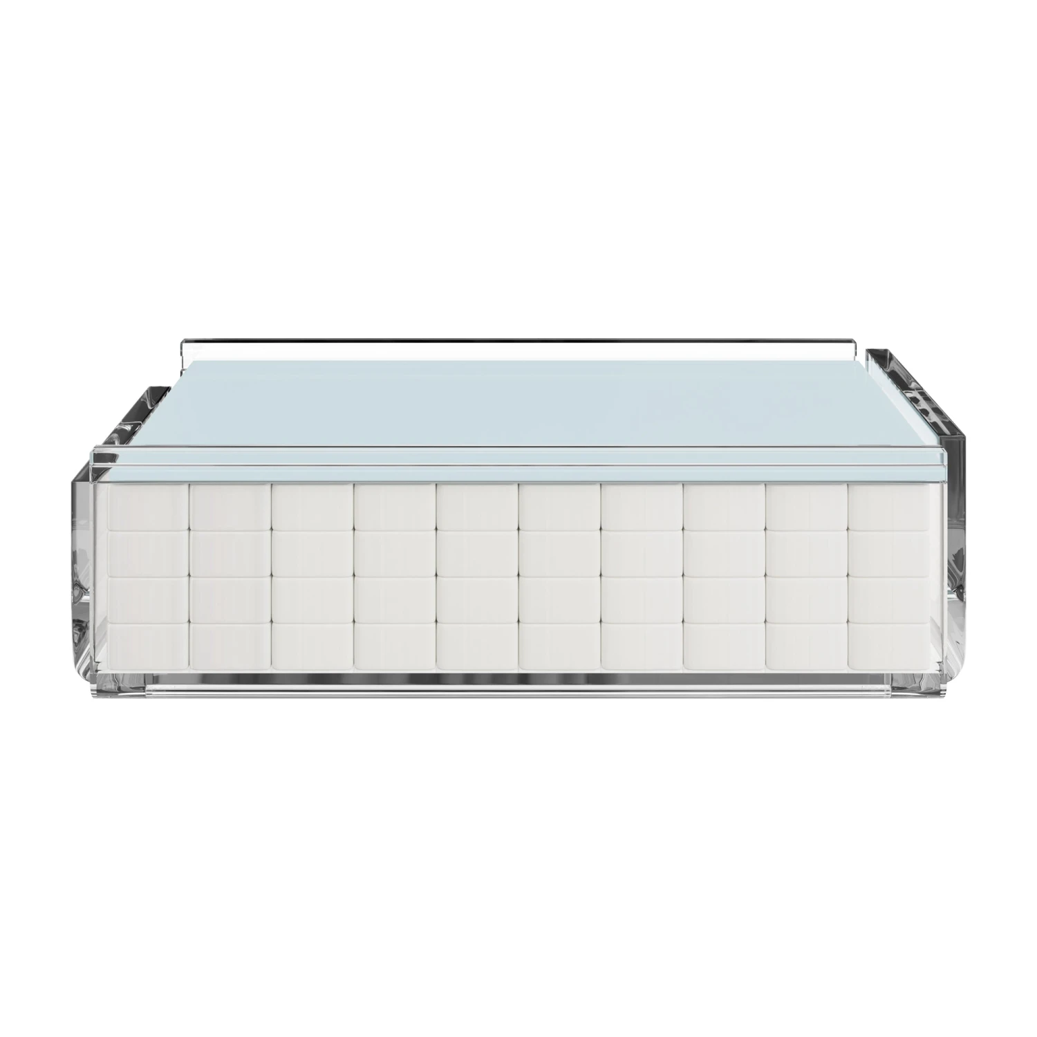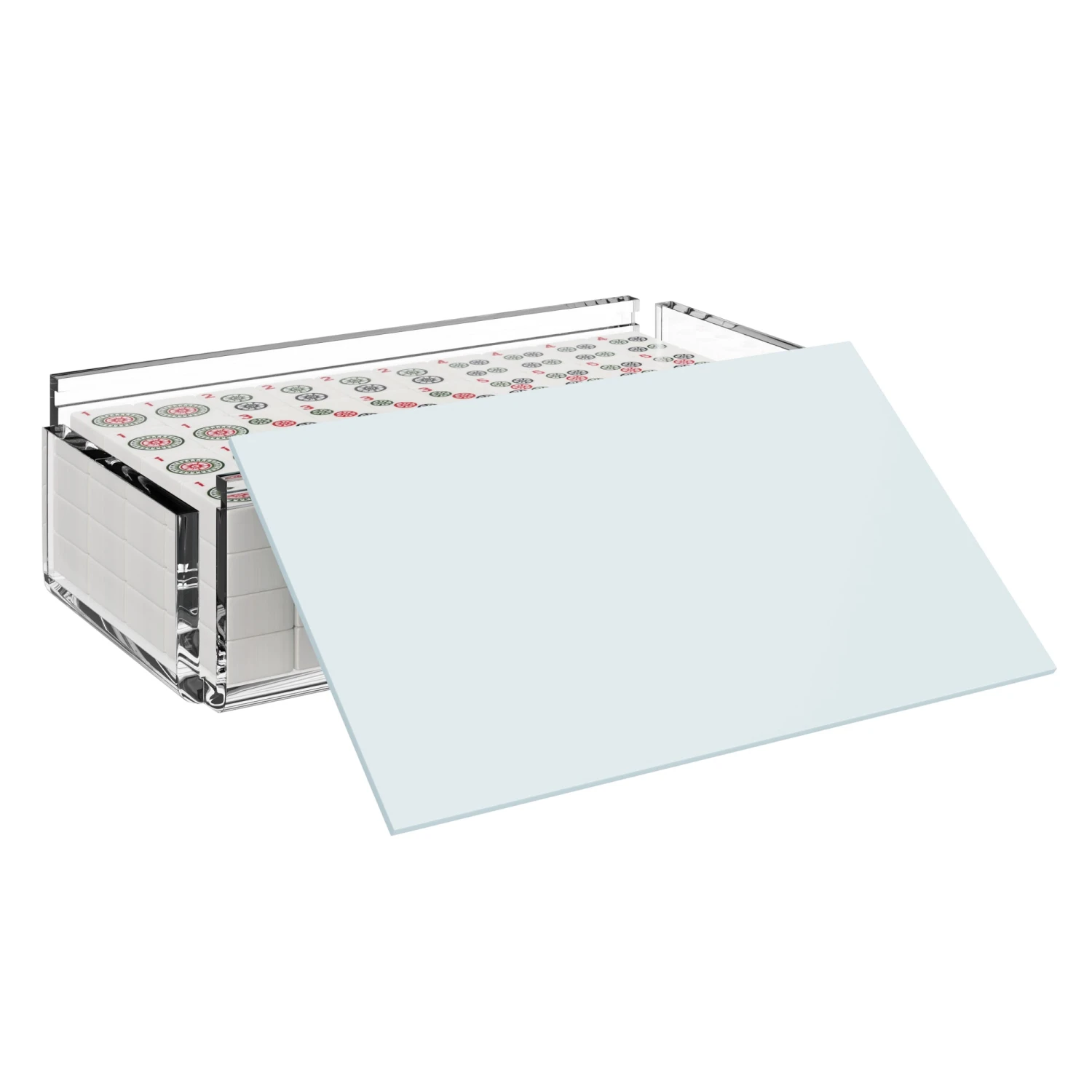 Luxe Dominoes’ Mahjong Set comes with tiles, 4 racks, how to play booklet, 3 extra blank tiles, 2 extra joker tiles and point markers. Each acrylic box is handmade by craftsmen in Miami and features standard all white tiles.Â