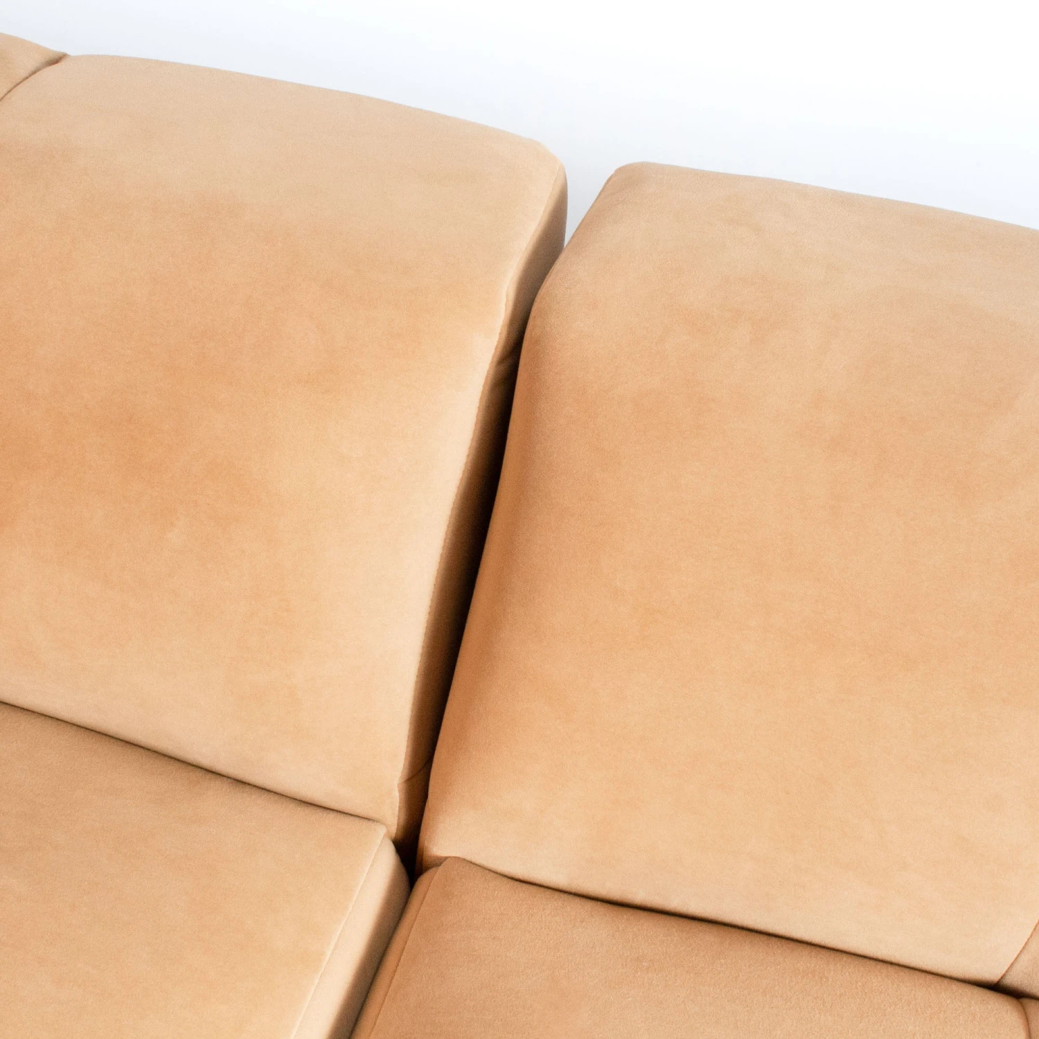 Contemporary and vintage-inspired, our Faye Sectional is roomy enough for the whole watch party. Warm caramel velvet and clean tufting details throughout bring a luxe feel to this unique piece.Â
