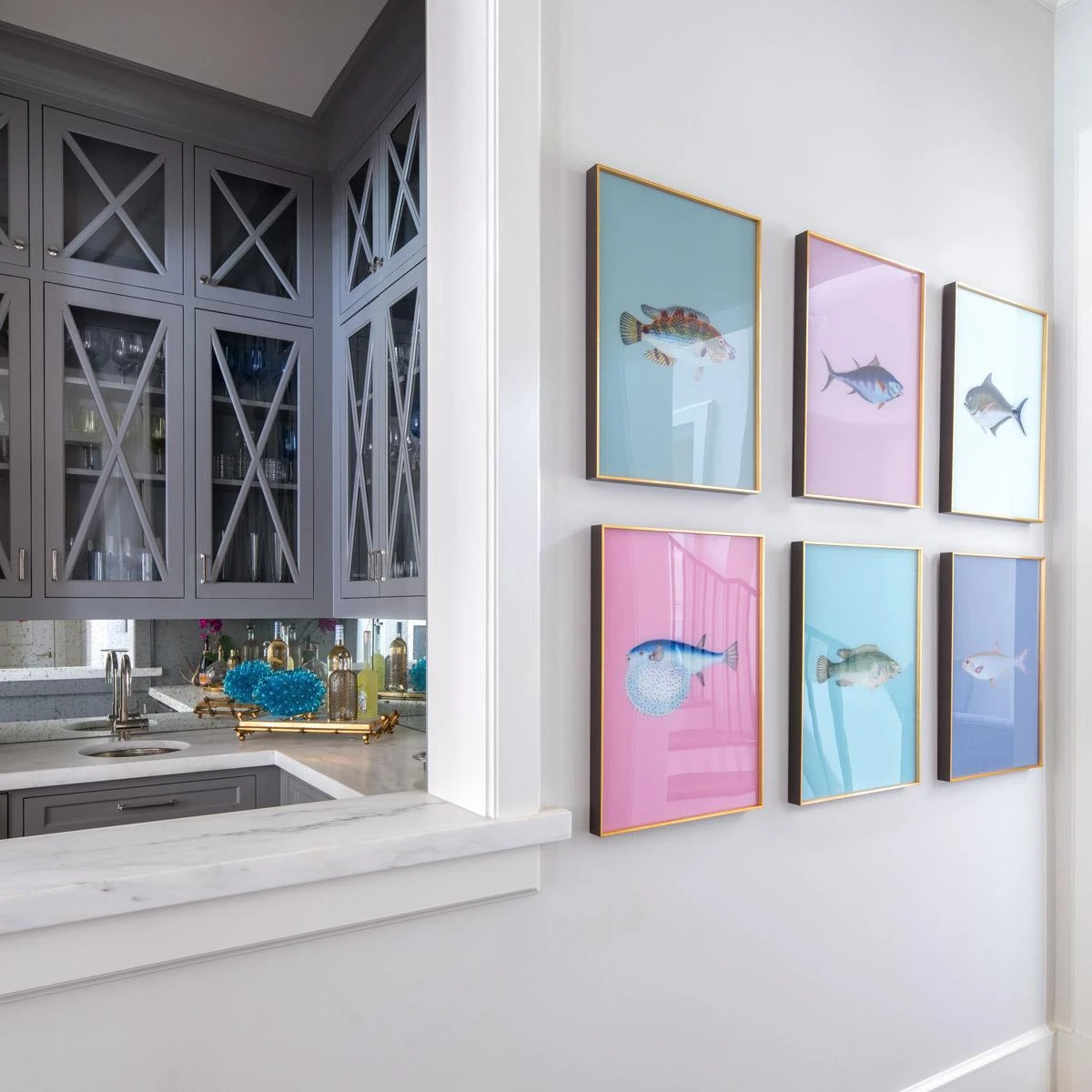 Scout exclusive pastel fish artwork. UV printed on acrylic film with a black and gold frame.