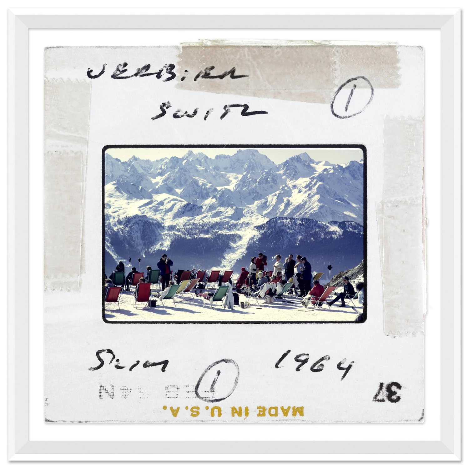 Photography by Slim Aarons of Holiday-makers enjoying the sun on a mountain top in Verbier, 1964.