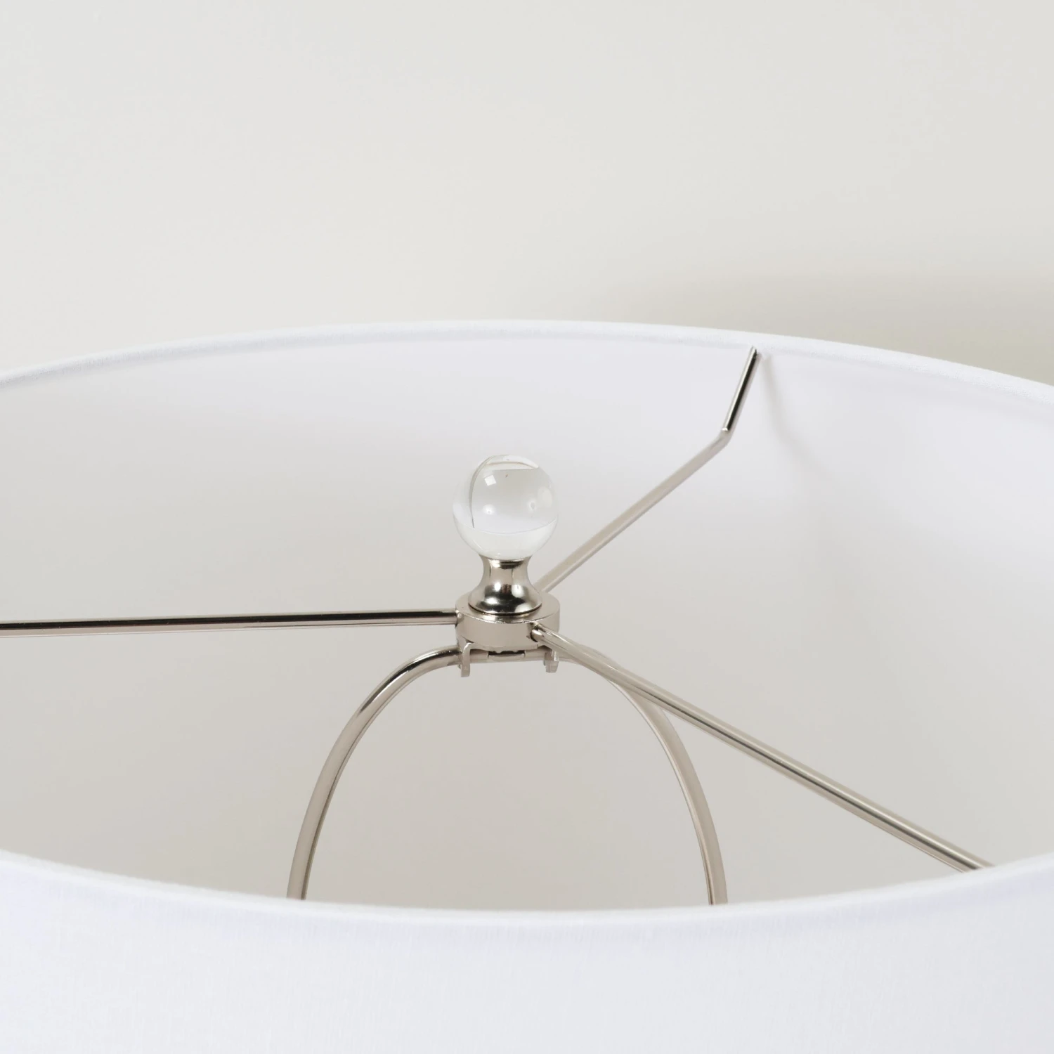 This gorgeous Italianate hand blown glass lamp features an acrylic base and a white linen shade with a round acrylic finial. We love the vibrant blue hue on this graceful design.