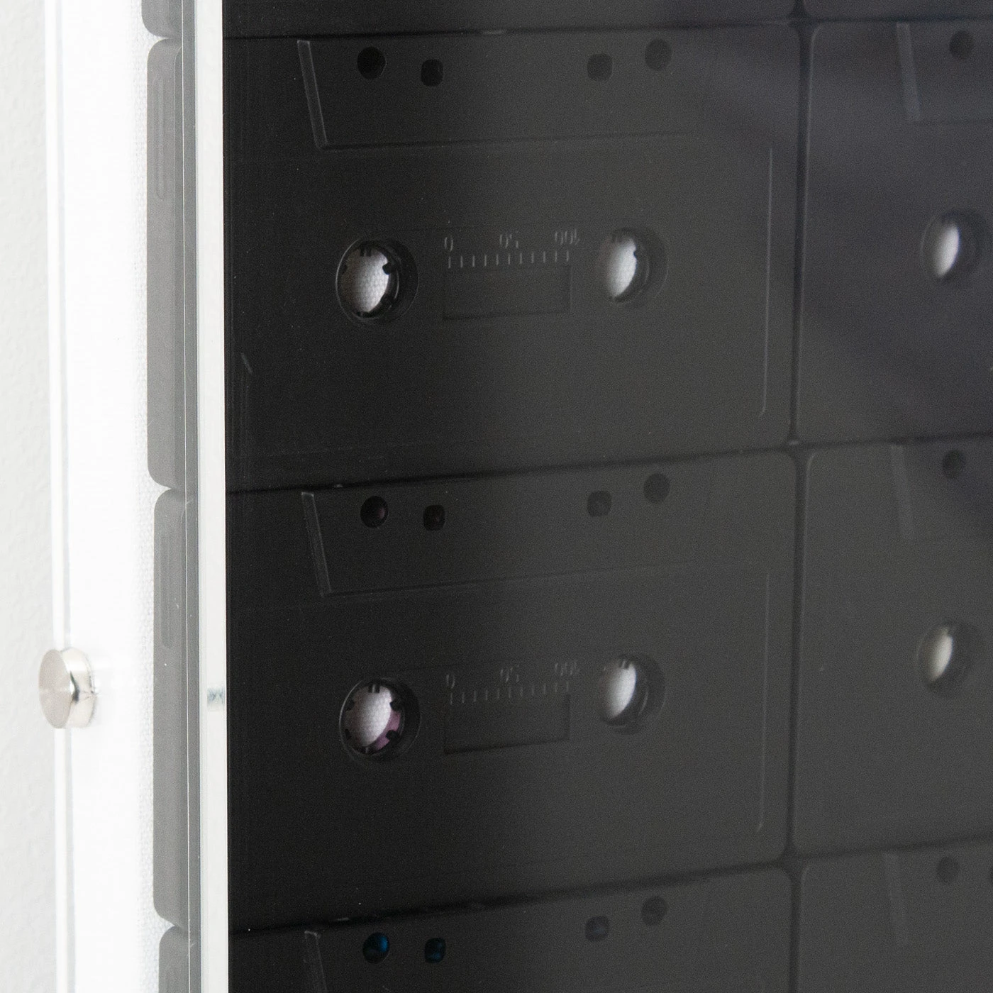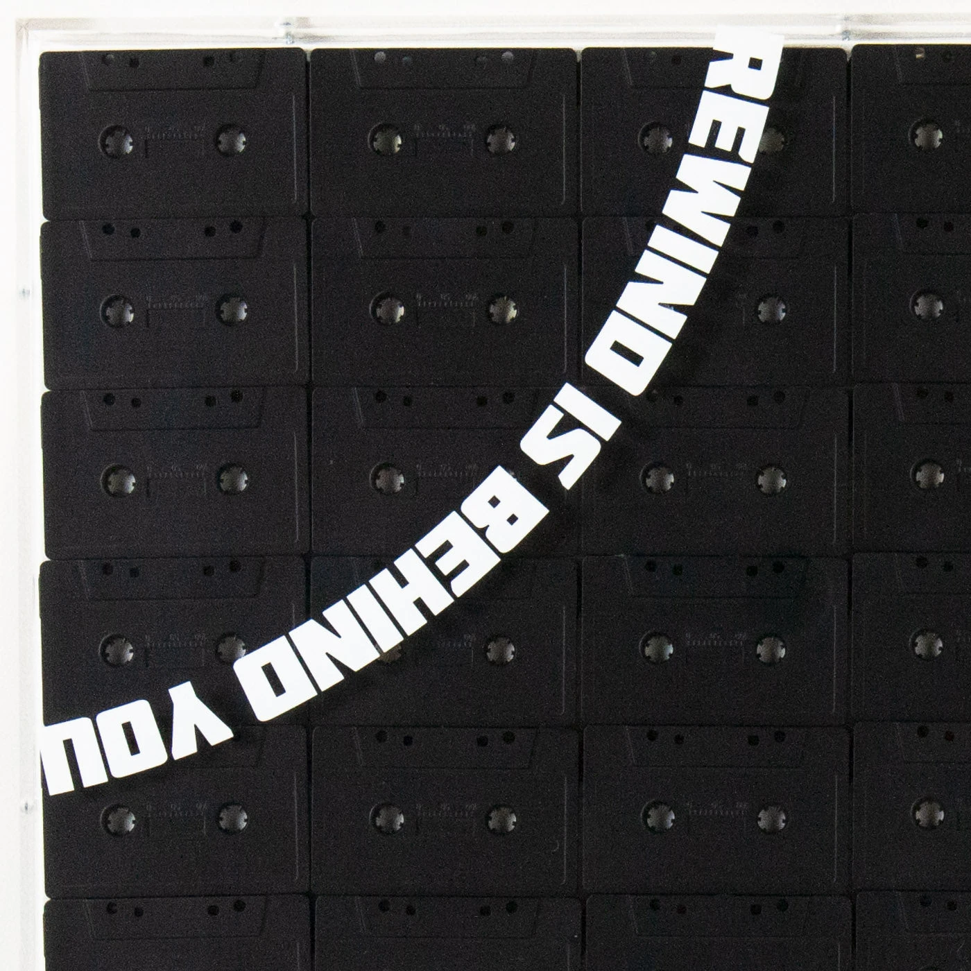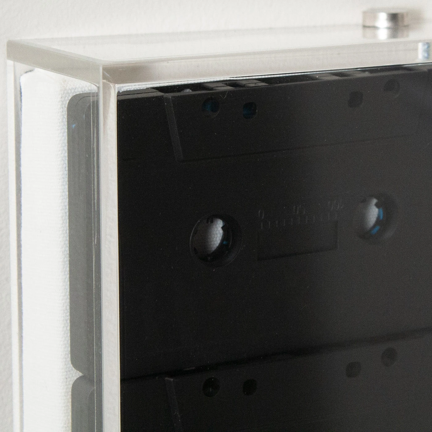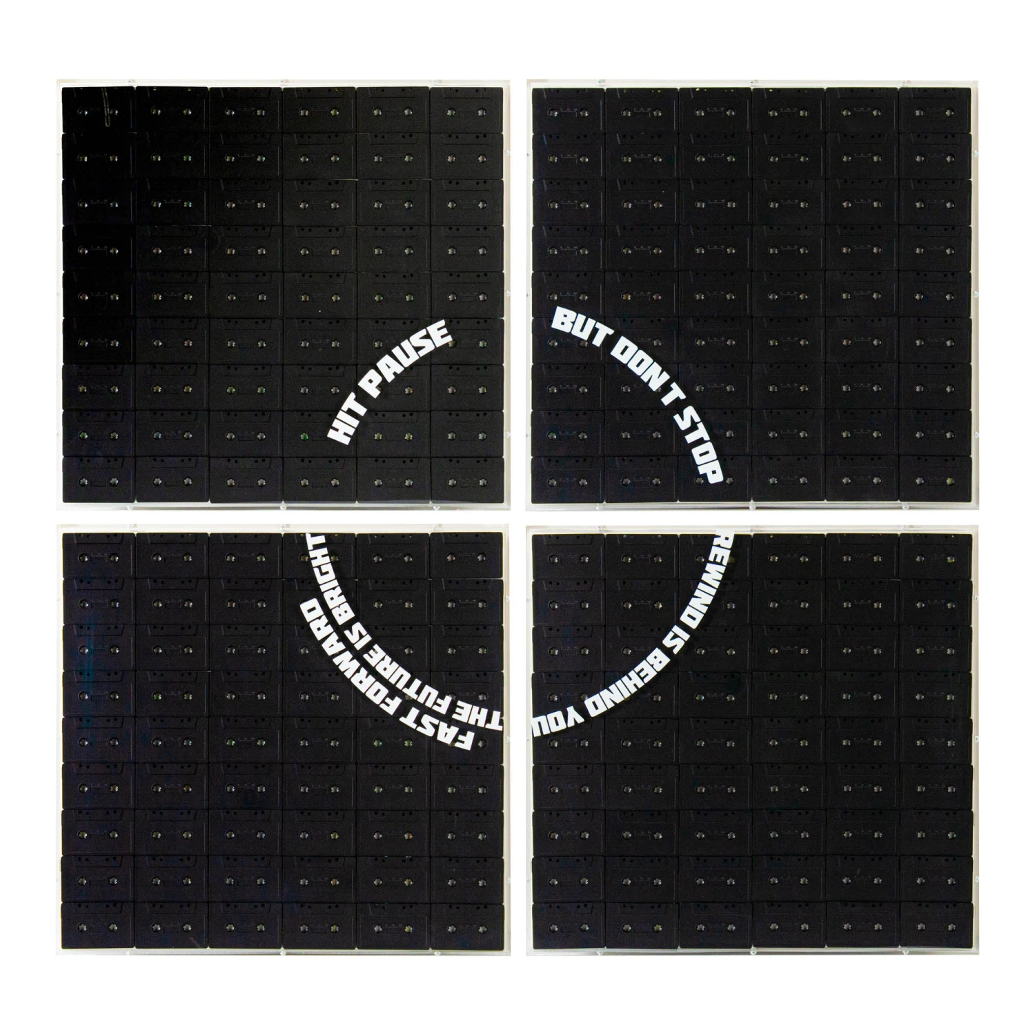 From the Tat Frederick studio, Hit Pause is made up of black cassette tapes fixed to white canvas with words ‘Hit Pause, But Don’t Stop, Rewind Is Behind You, Fast Forward The Future Is Bright’ printed on each panel to form a circle when the piece is together. Framed in an acrylic shadowbox.
