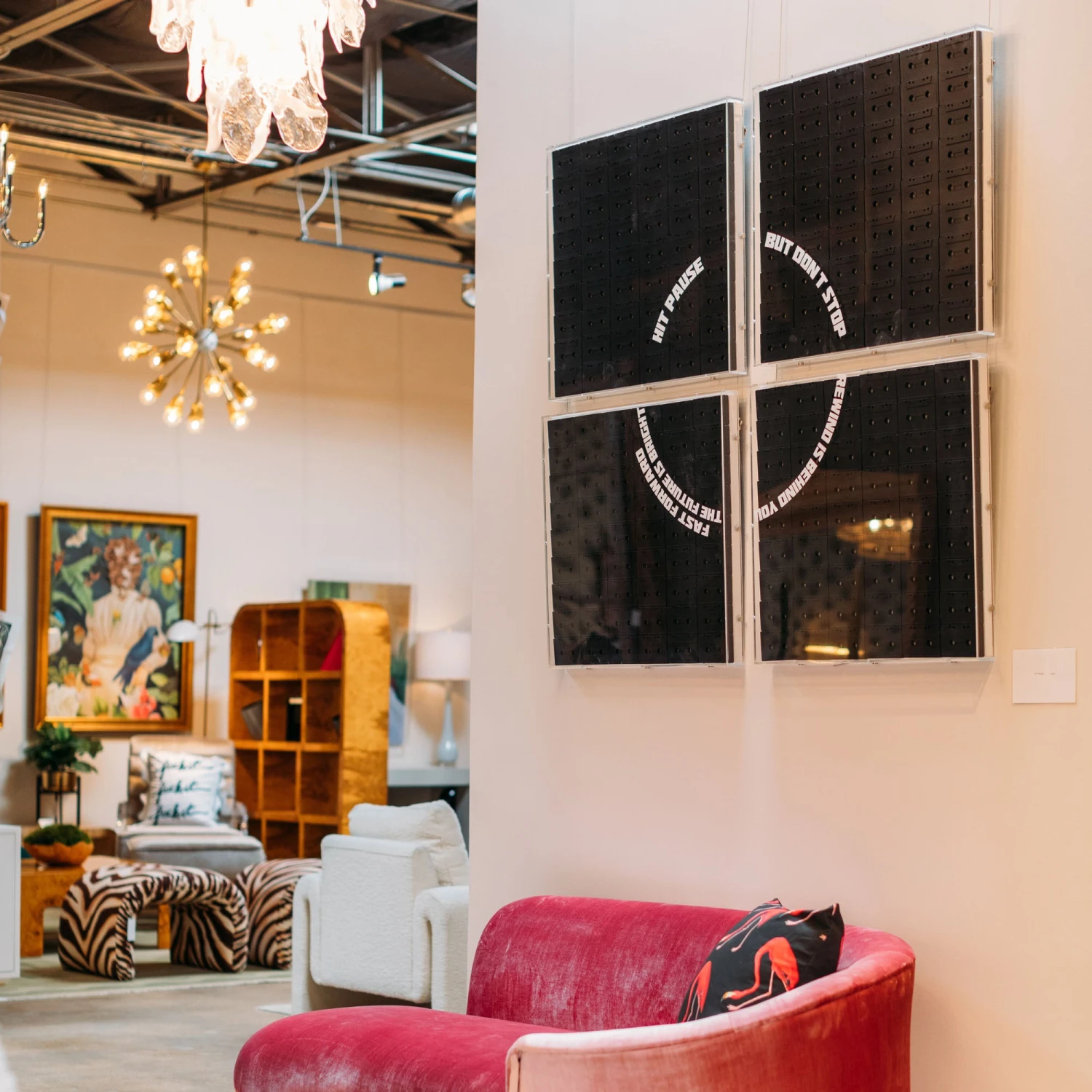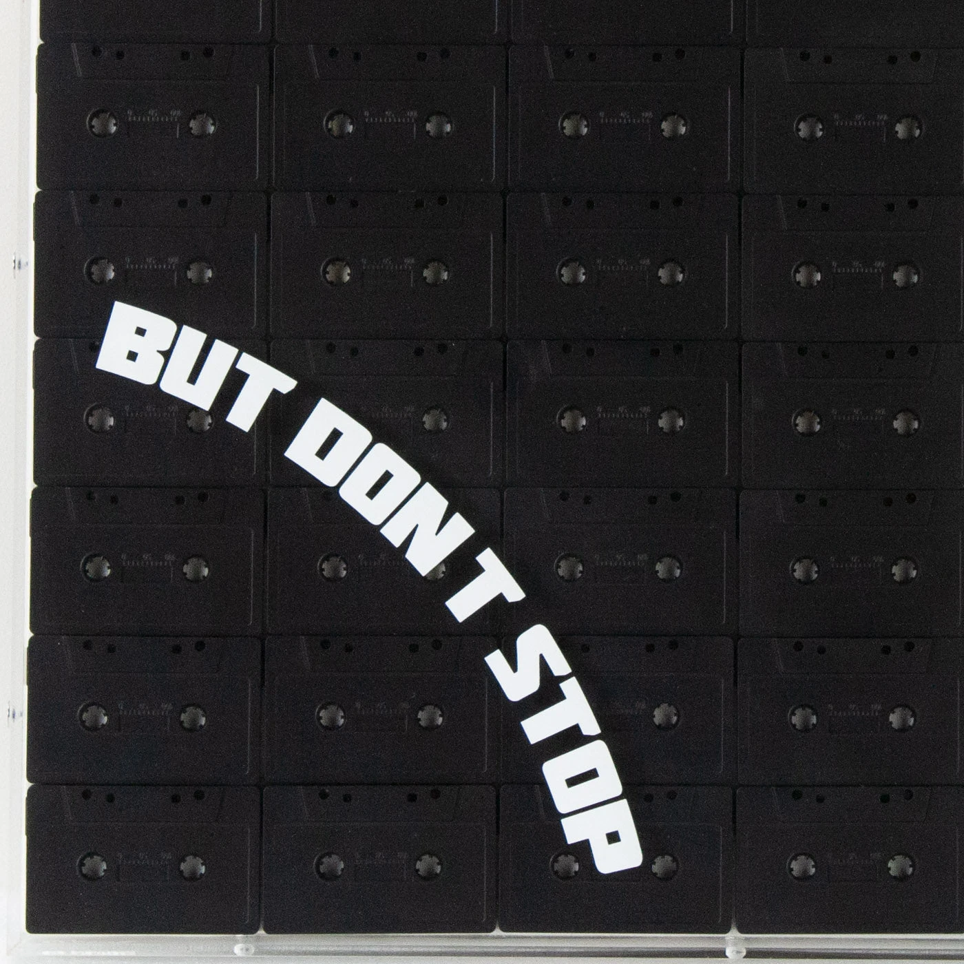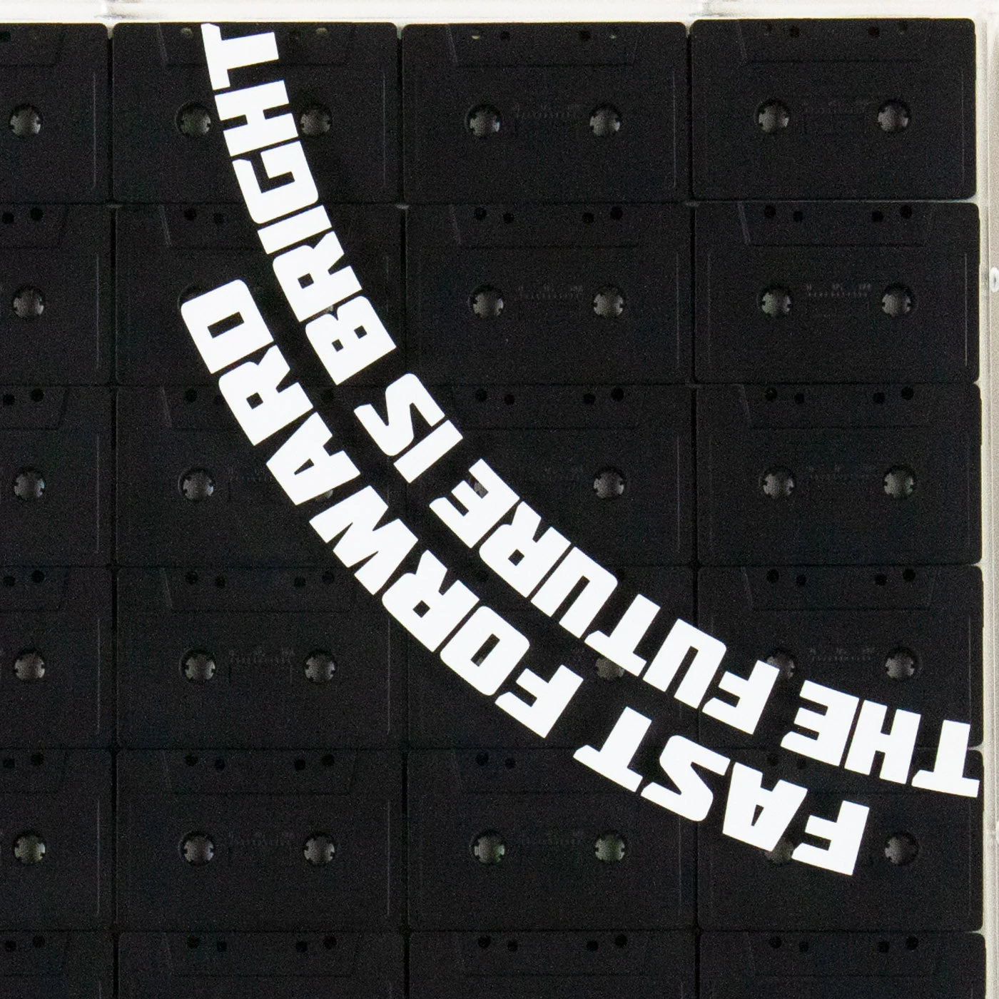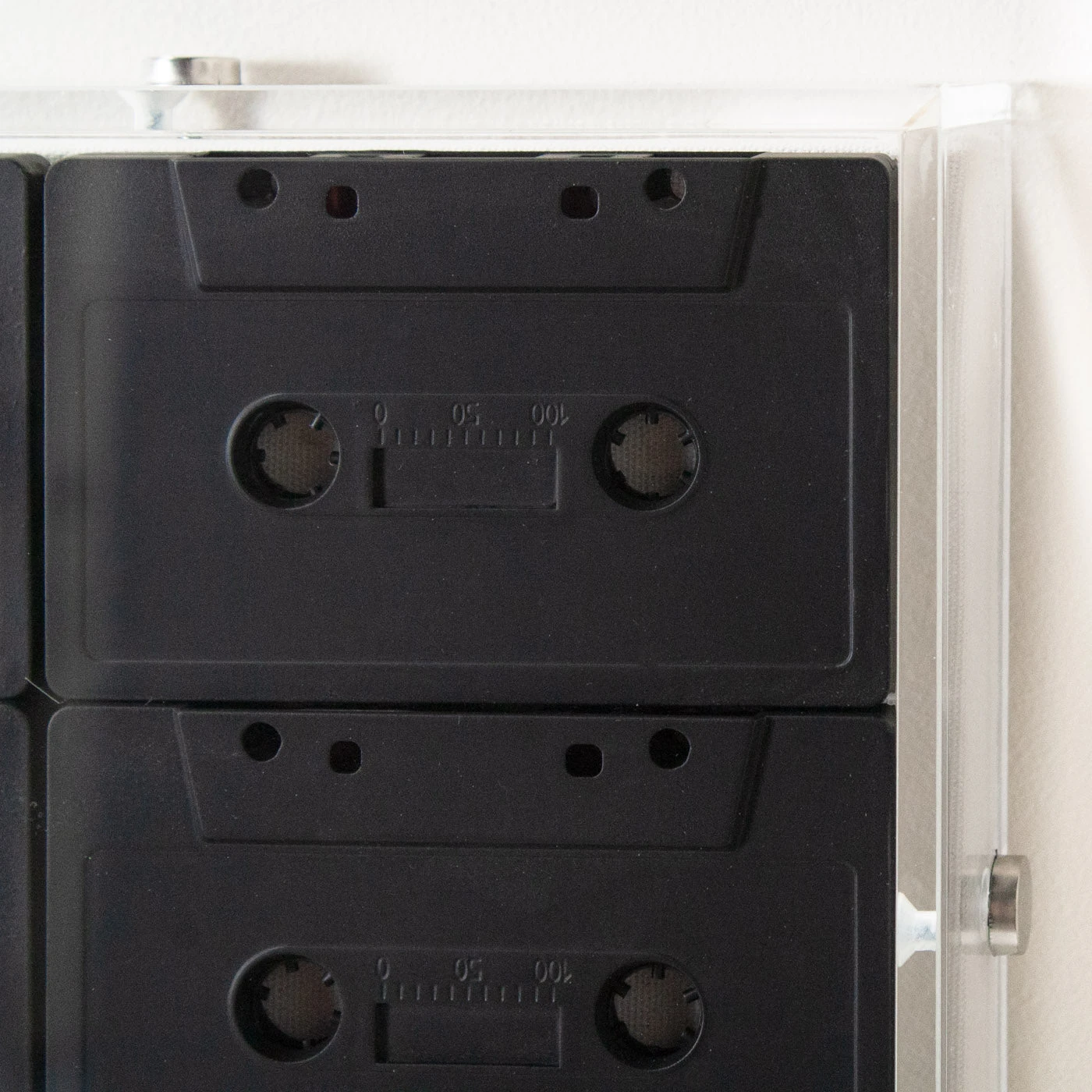 From the Tat Frederick studio, Hit Pause is made up of black cassette tapes fixed to white canvas with words ‘Hit Pause, But Don’t Stop, Rewind Is Behind You, Fast Forward The Future Is Bright’ printed on each panel to form a circle when the piece is together. Framed in an acrylic shadowbox.