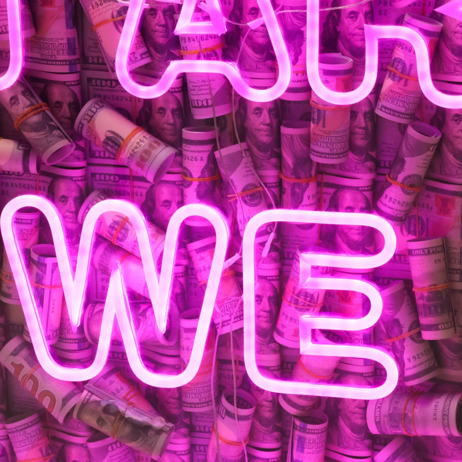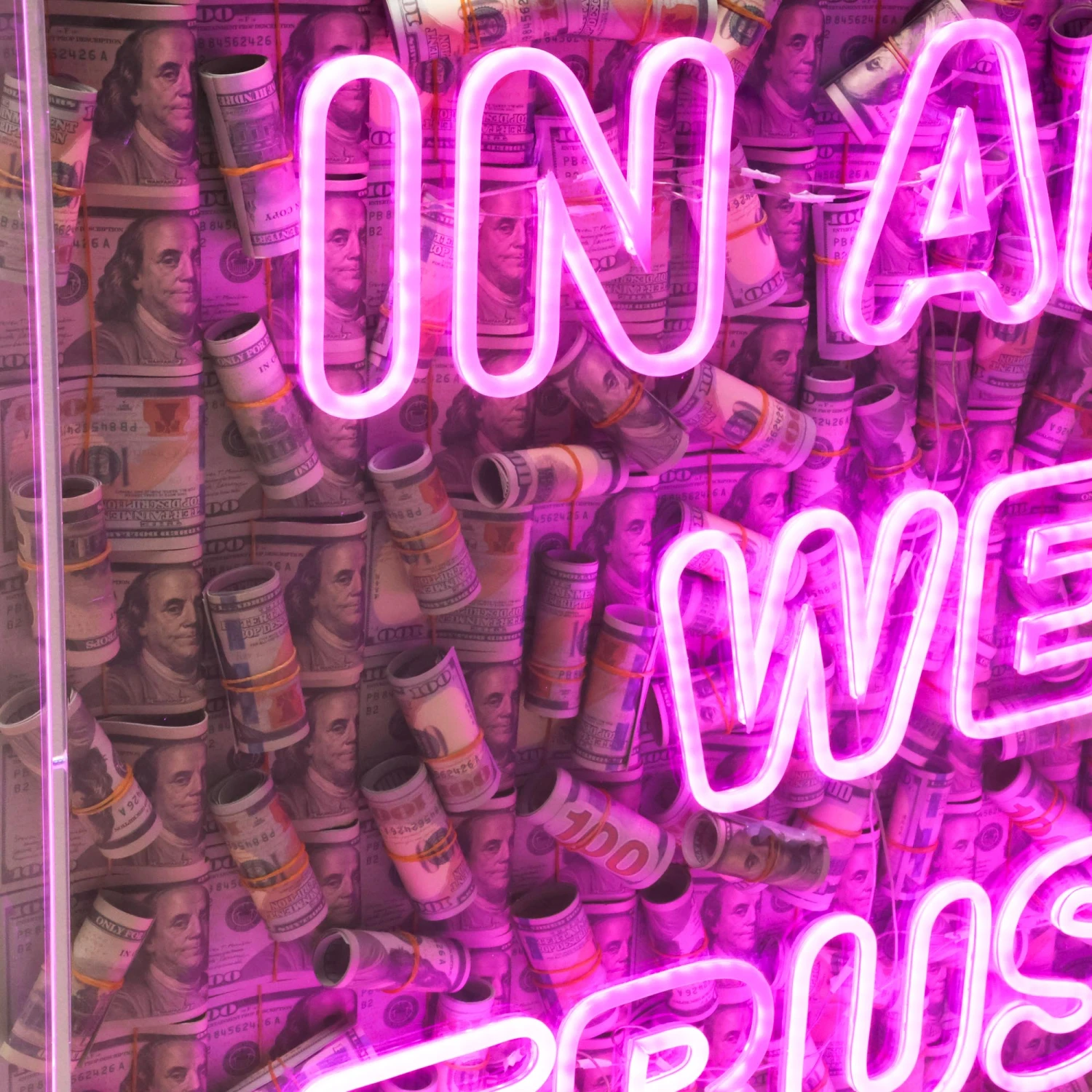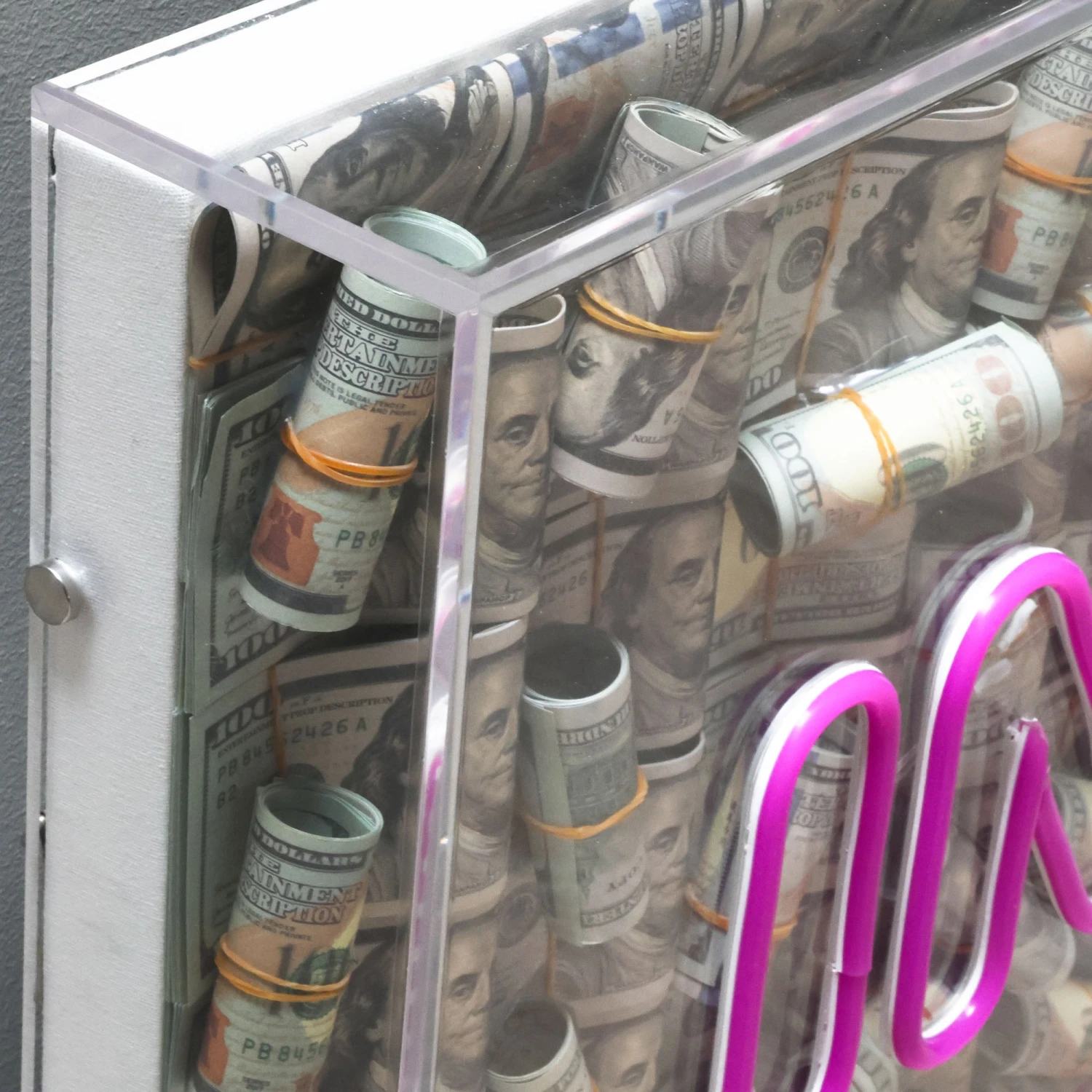 From the Tat Frederick studio, ‘In Art We Trust’ features money rolls and neon lights. Once each money roll is hand-placed, it is encased in an acrylic shadowbox with the neon lights applied to the outside of the shadowbox.Â