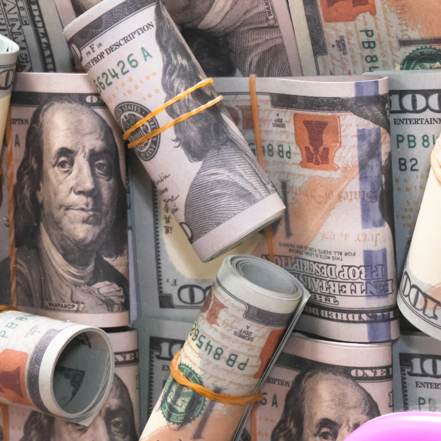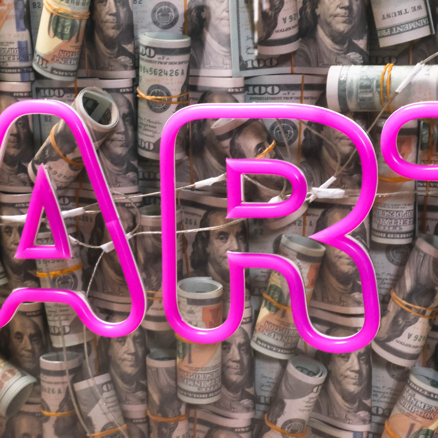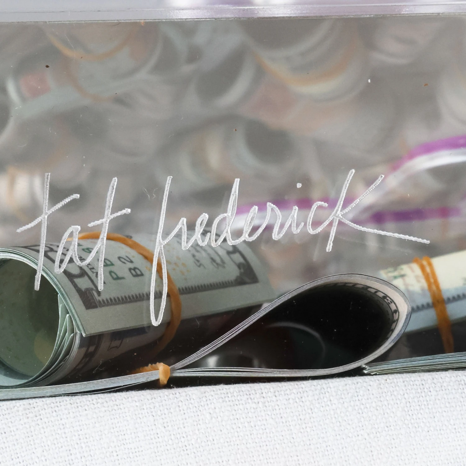 From the Tat Frederick studio, ‘In Art We Trust’ features money rolls and neon lights. Once each money roll is hand-placed, it is encased in an acrylic shadowbox with the neon lights applied to the outside of the shadowbox.Â