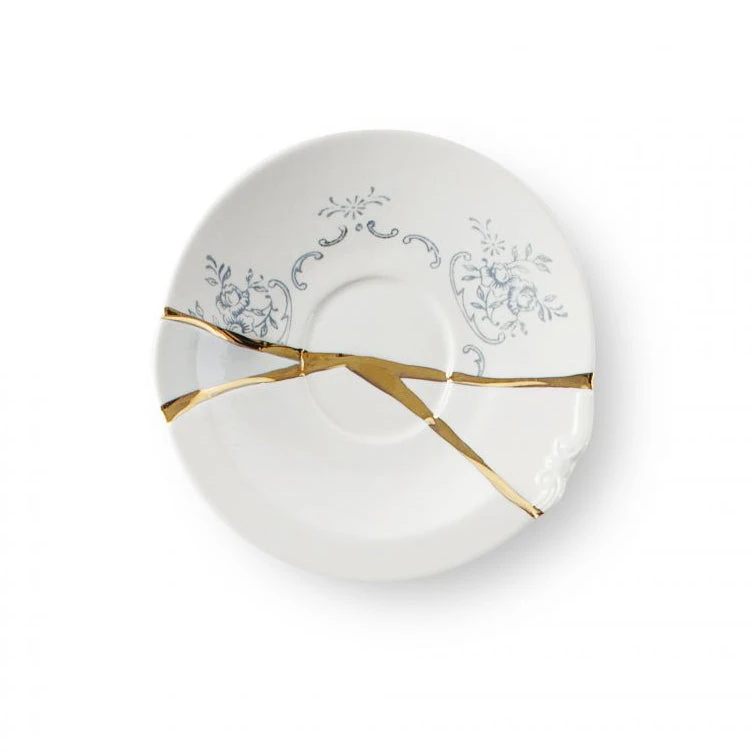 Kintsugi Japanese art assumes contemporary shapes. The delicate porcelain is glorified and enriched with gold fragments for a tableware collection made of charming and unexpected compositions.