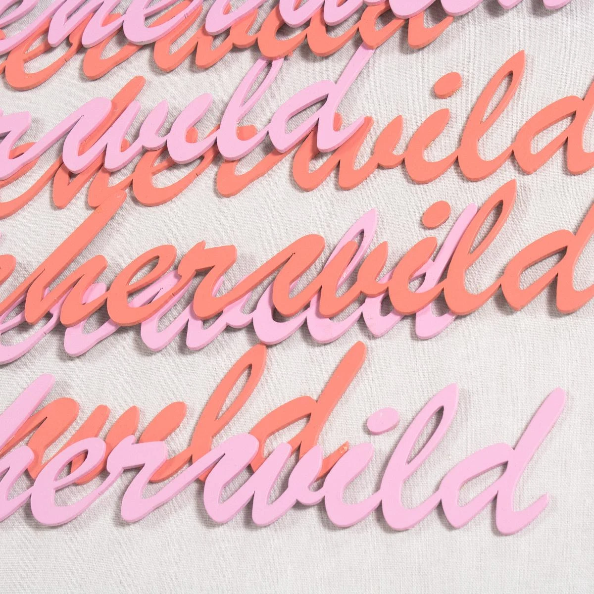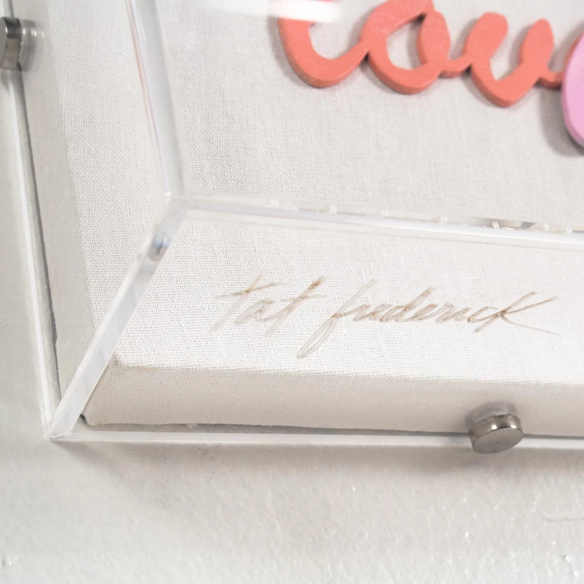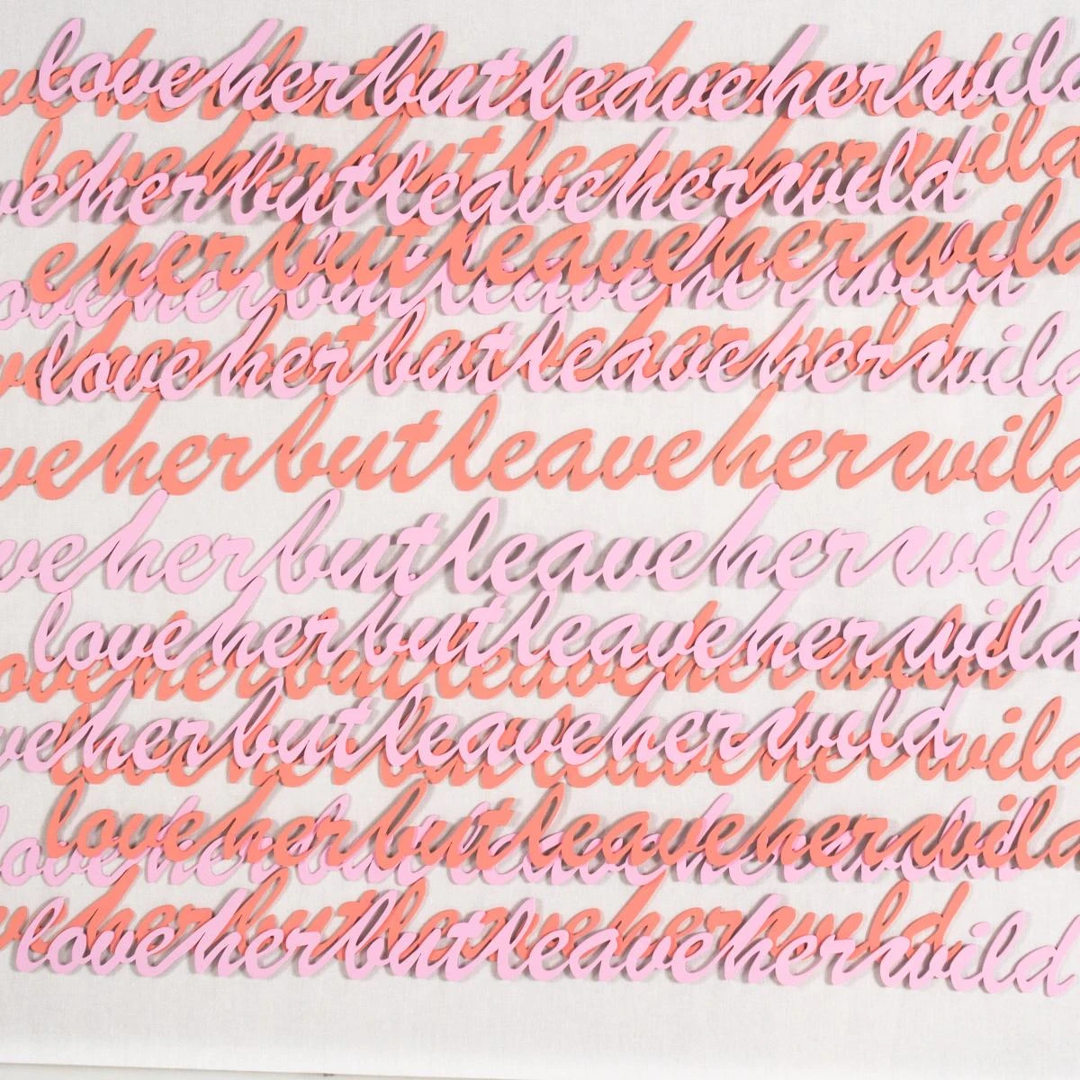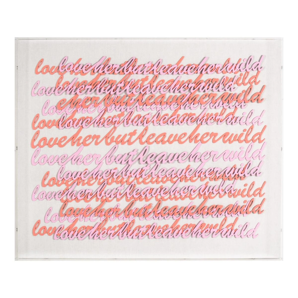 Hand-cut and painted words form the famous Atticus Poetry quote, “love her but leave her wild”. Arranged on white canvas and framed in an acrylic shadowbox.