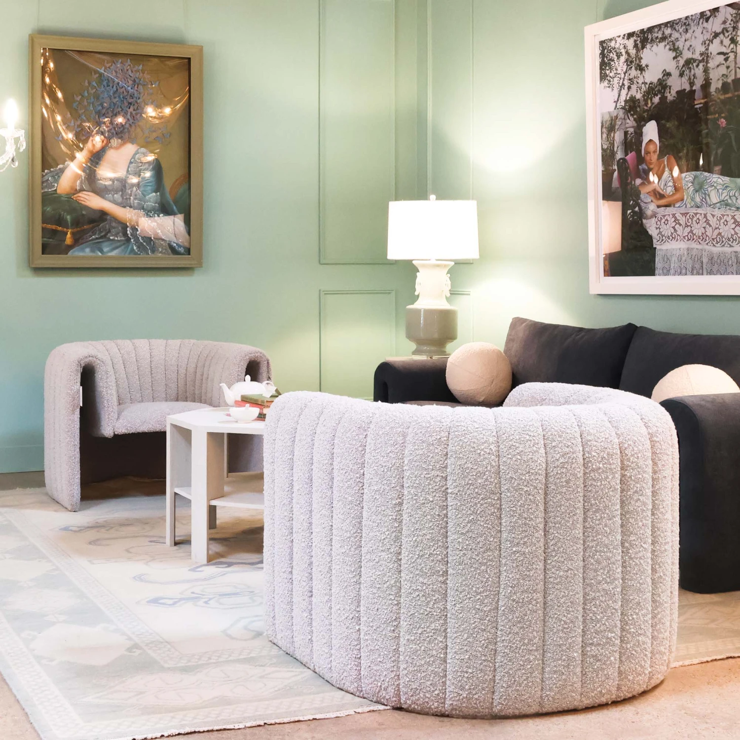Contemporary curves and a waterfall design are the key features of our Miles Chair. All-over channeling on the back gives this sweet seat a sophisticated feel. Upholstered in a cozy grey boucle fabric, the Miles is sure to envelope you in modern comfort.
