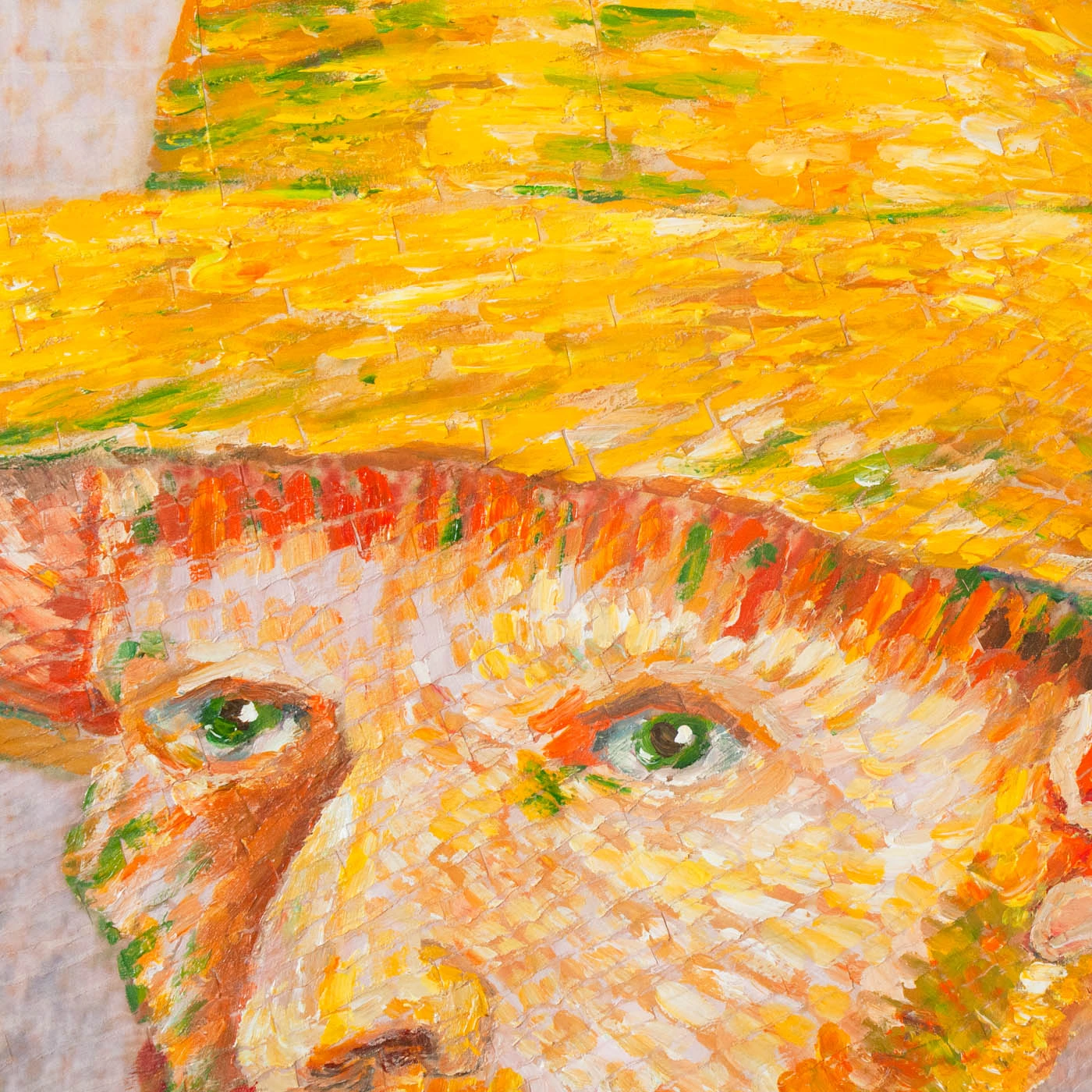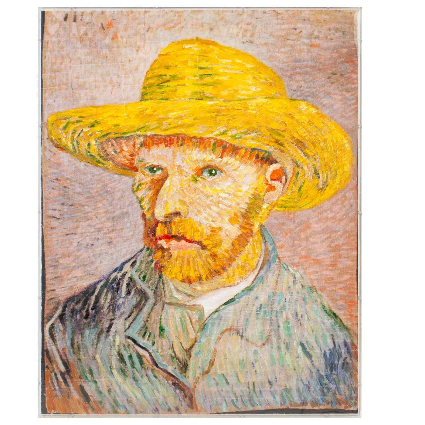 A reimagination from the Tat Frederick studio, “Paper Vince in Straw Hat” is crafted out of colored paper and fixed to a canvas. Framed in an acrylic shadowbox.