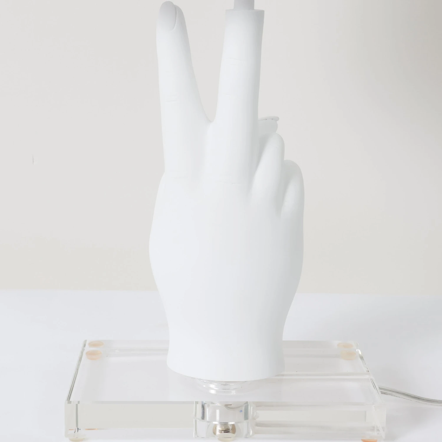 Featuring a hand making the peace sign, the Peace Lamp sits atop an acrylic base and is topped with a square linen shade. Illuminate your space with contemporary fun!