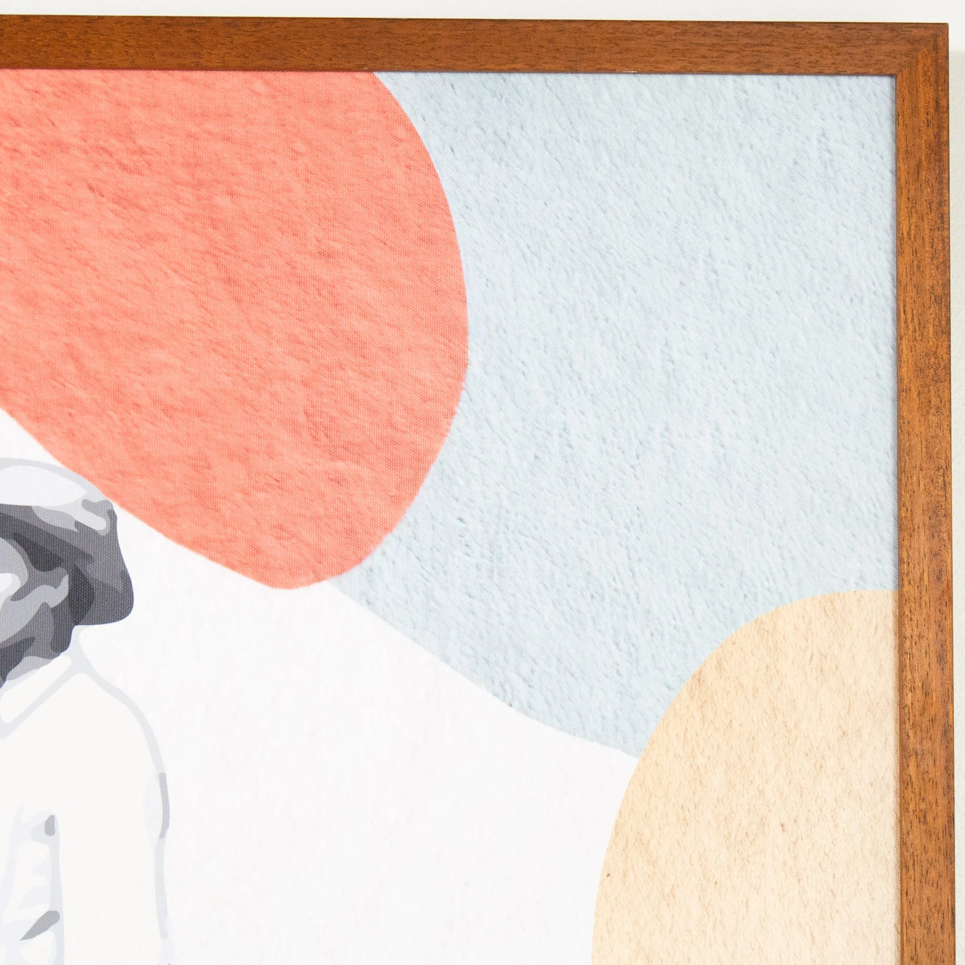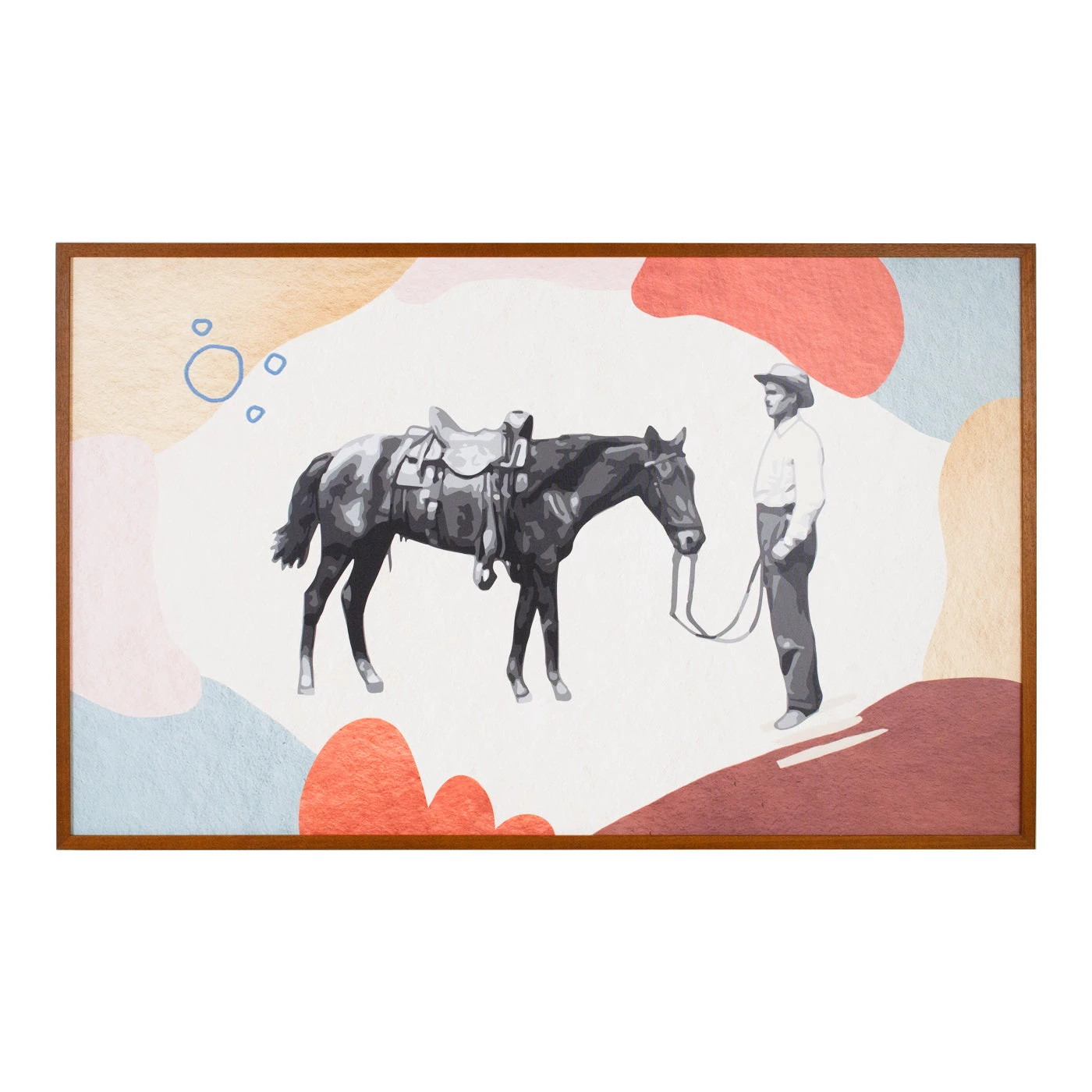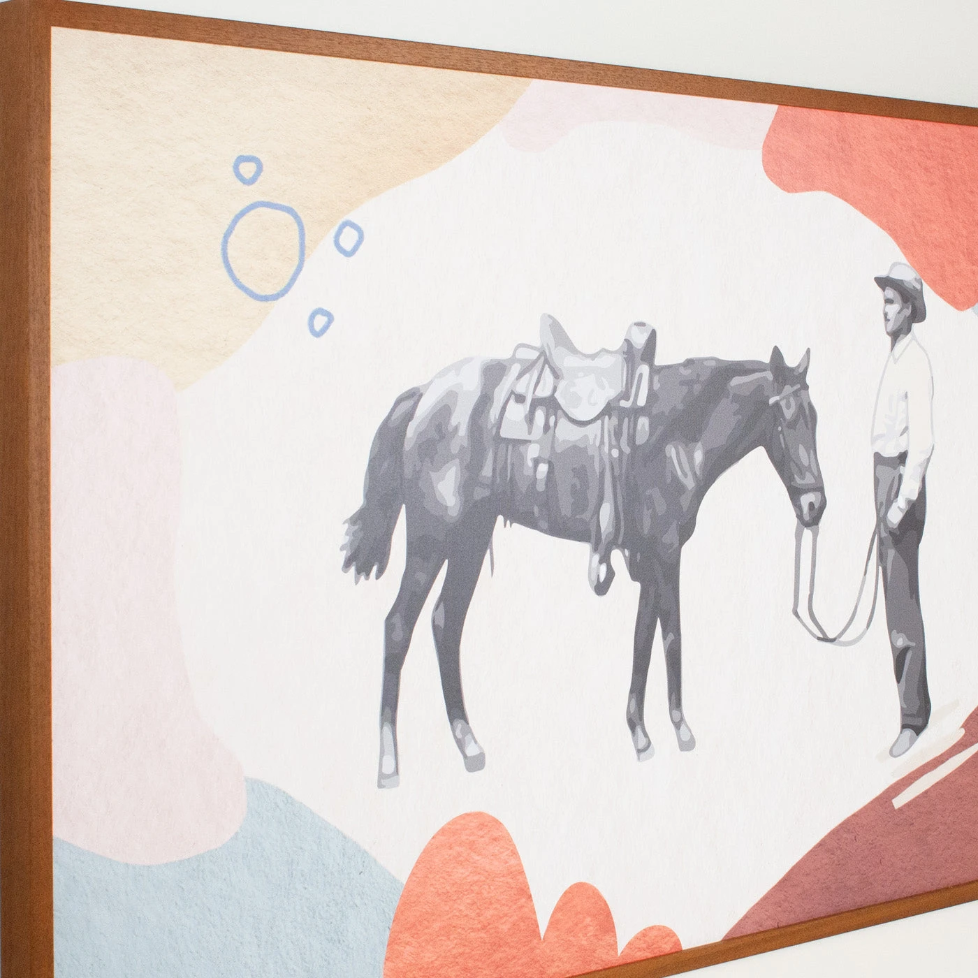 New from the Tat Frederick studio, Pierre’s Place features a cowboy with his horse, surrounded by a vibrant painterly border. Printed on canvas and framed in wood.