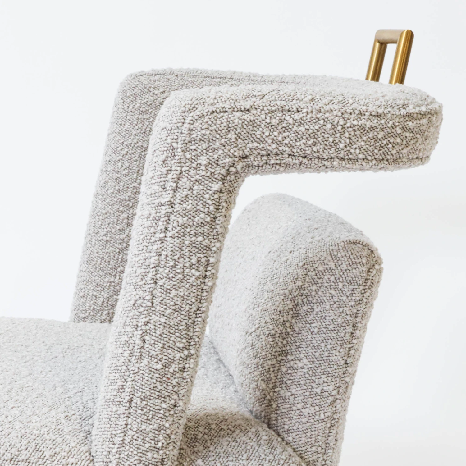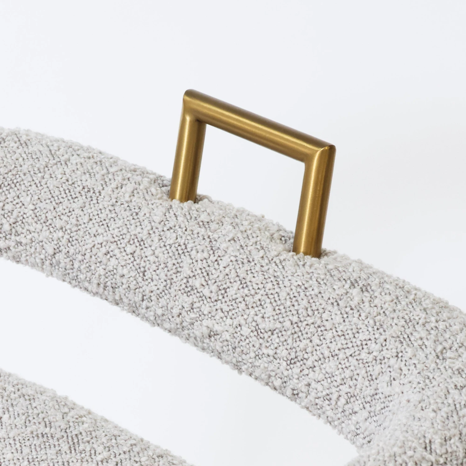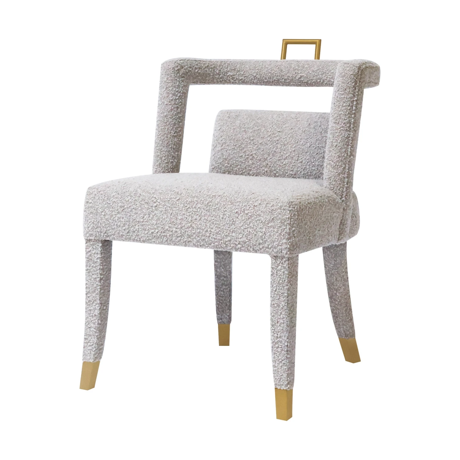 Our Revelry Dining Chair provides all of the modern interest you want with the softness of light grey boucle fabric. We love the brass accents and unique open back design.Â