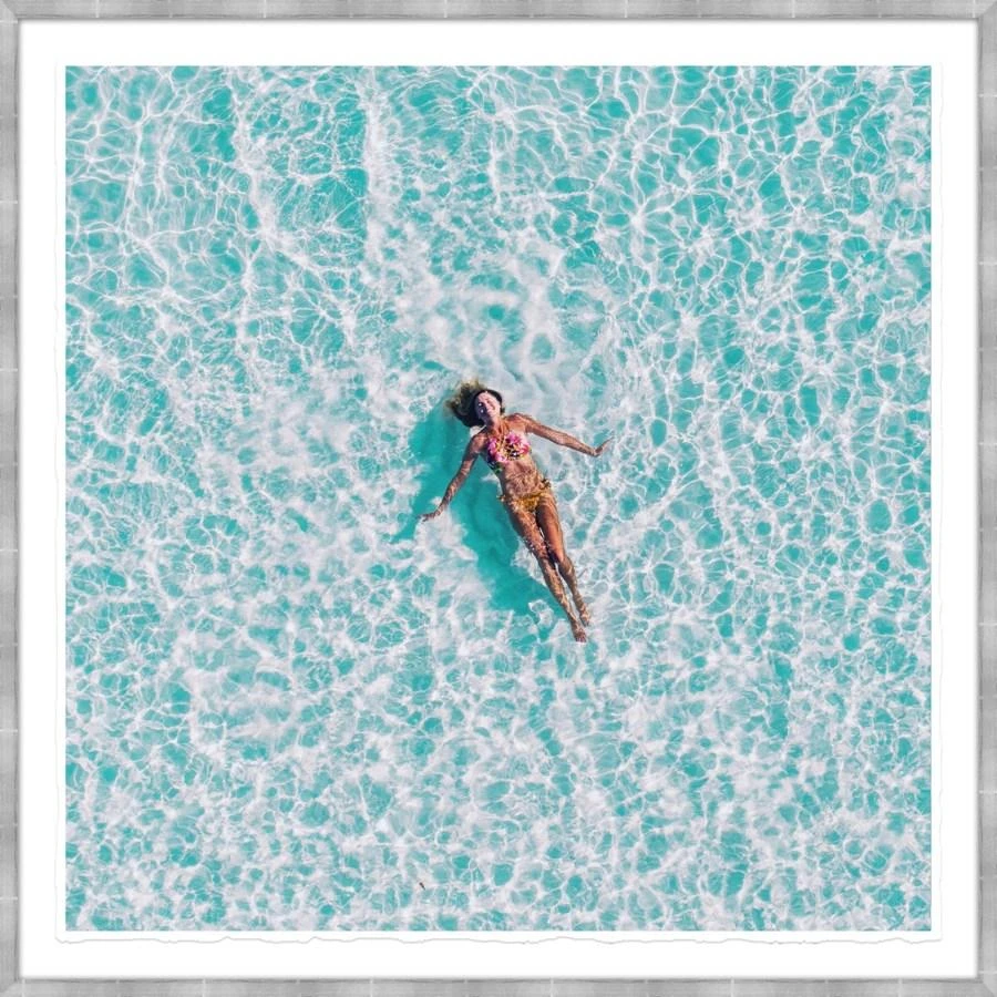 Gicleé print of a woman floating in the ocean. ‘See From the Sky’ is printed on archival paper and framed in a silver painted wood frame.