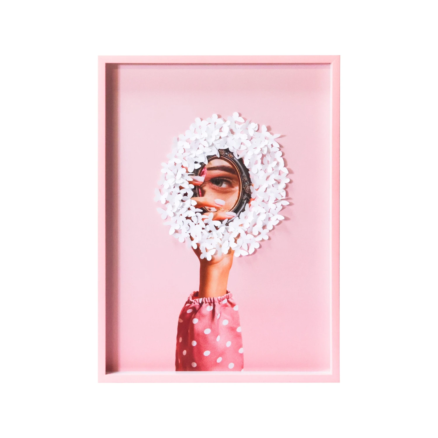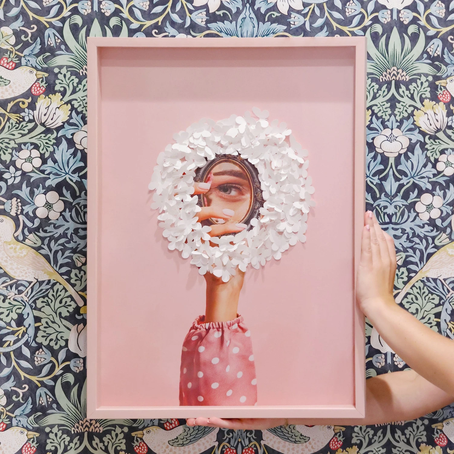 From the Tat Frederick studio, Self Reflections features a Giclee printed portrait of a pink mirror with hand-placed butterflies. Framed in pink.Â
