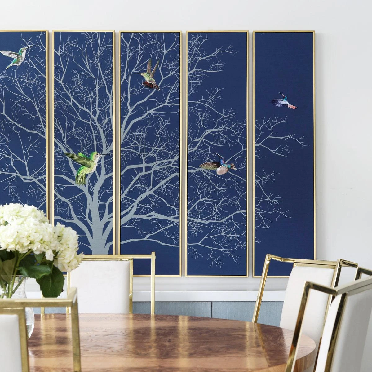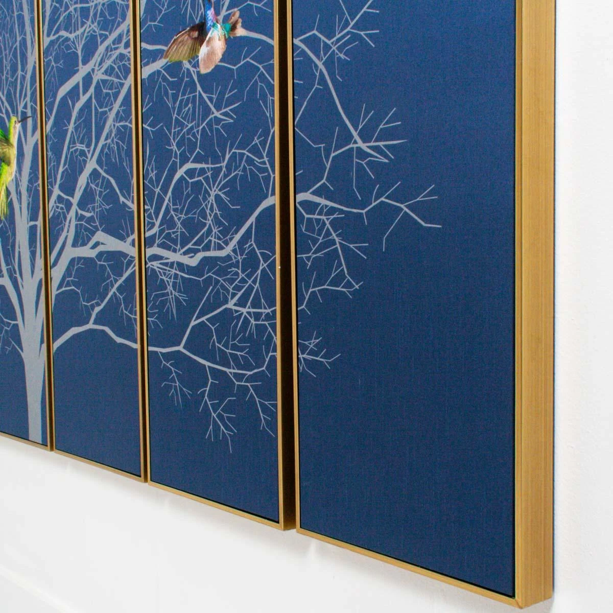 Size: Each panel is 12.5″ W, 2″ D, 50″ H; when hung, this piece is about 80″ W
