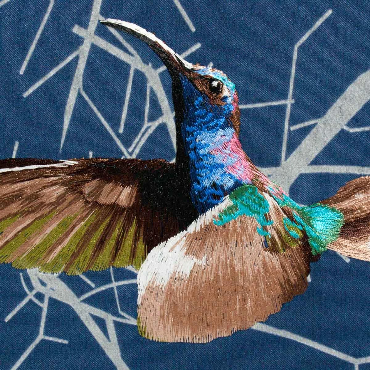 The Shel features 6 silk panels with hand-embroidered birds. The result is a beautiful shimmery three-dimensional effect.
