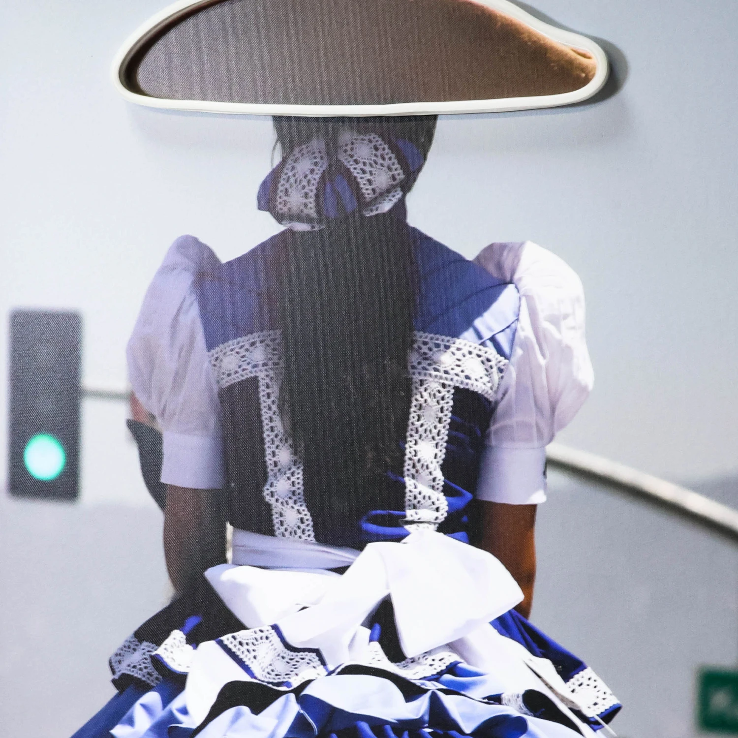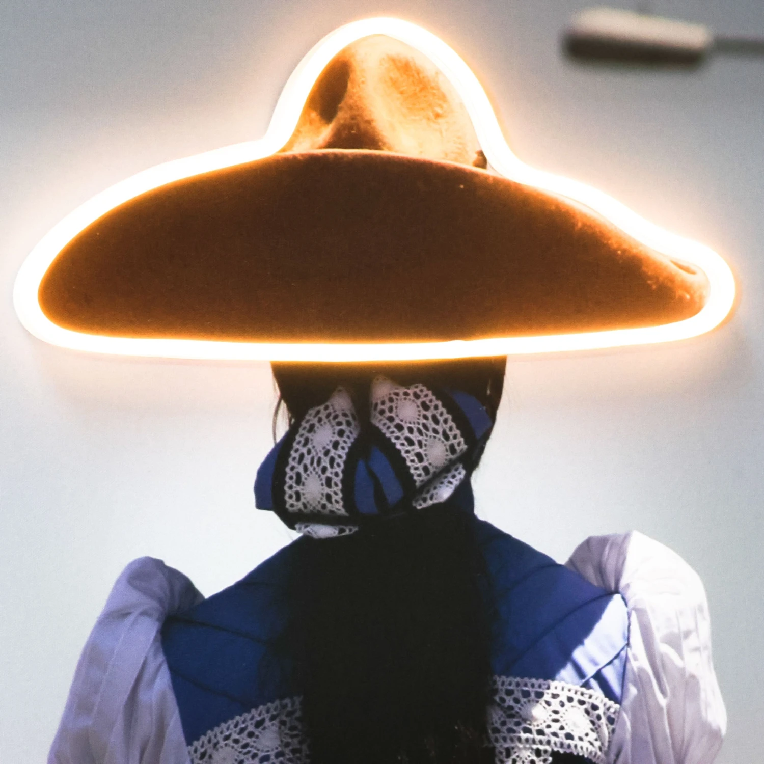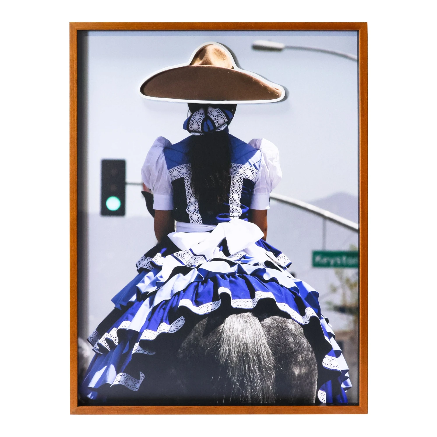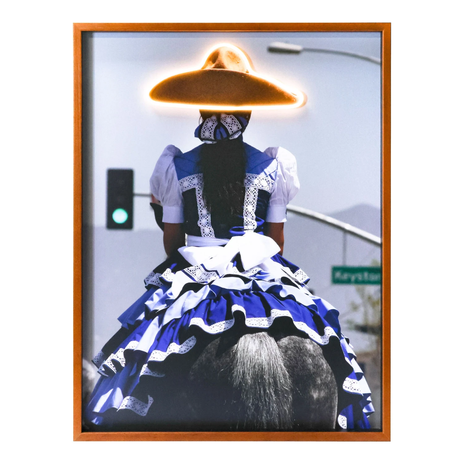 Sister Ann features a photograph of a woman riding horseback at a traffic light with a light-up neon hat. Framed in brown.