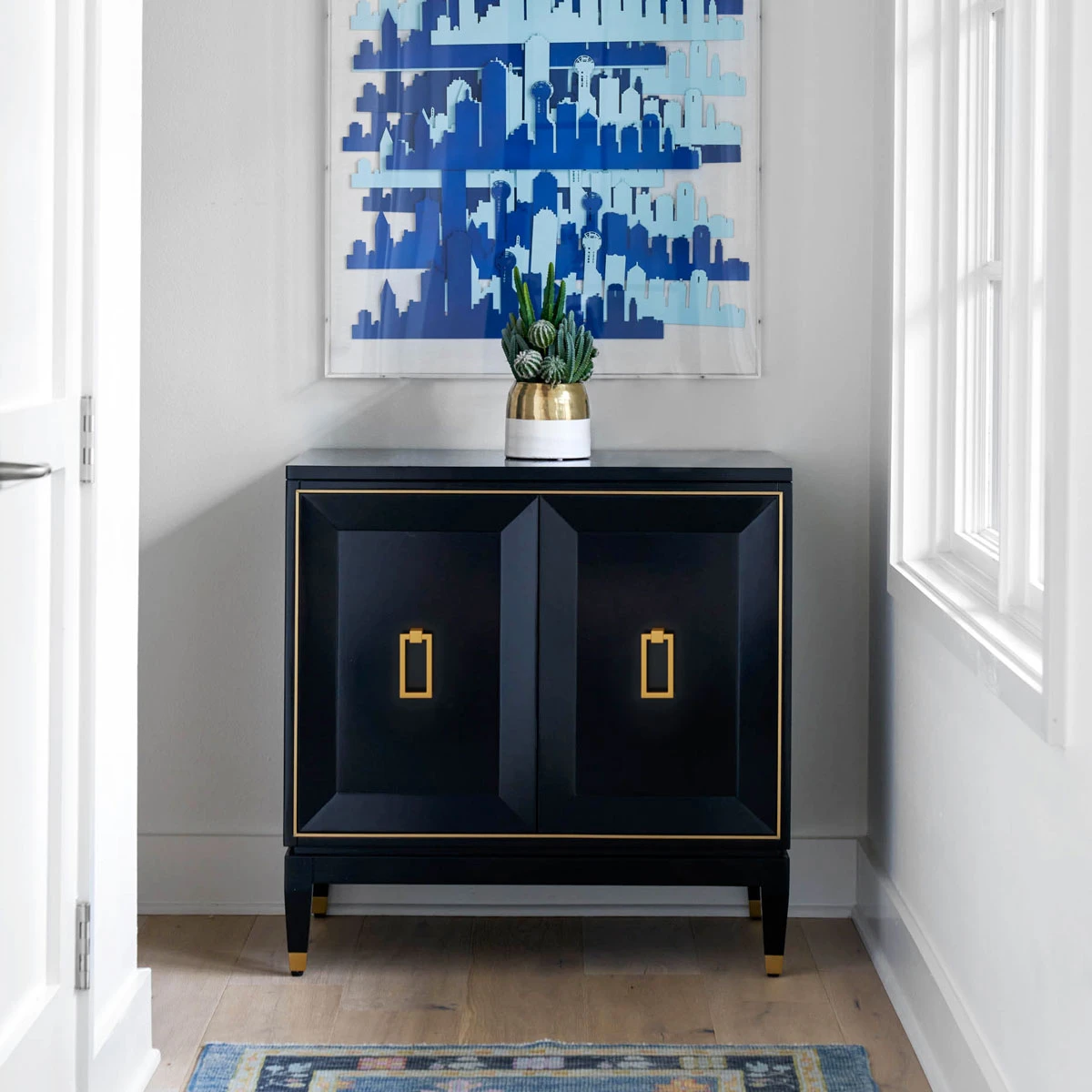 Our Valentine Chest features semi-gloss black lacquer against brass trim, rectangle pulls and sabots. What’s not to love about this beauty?